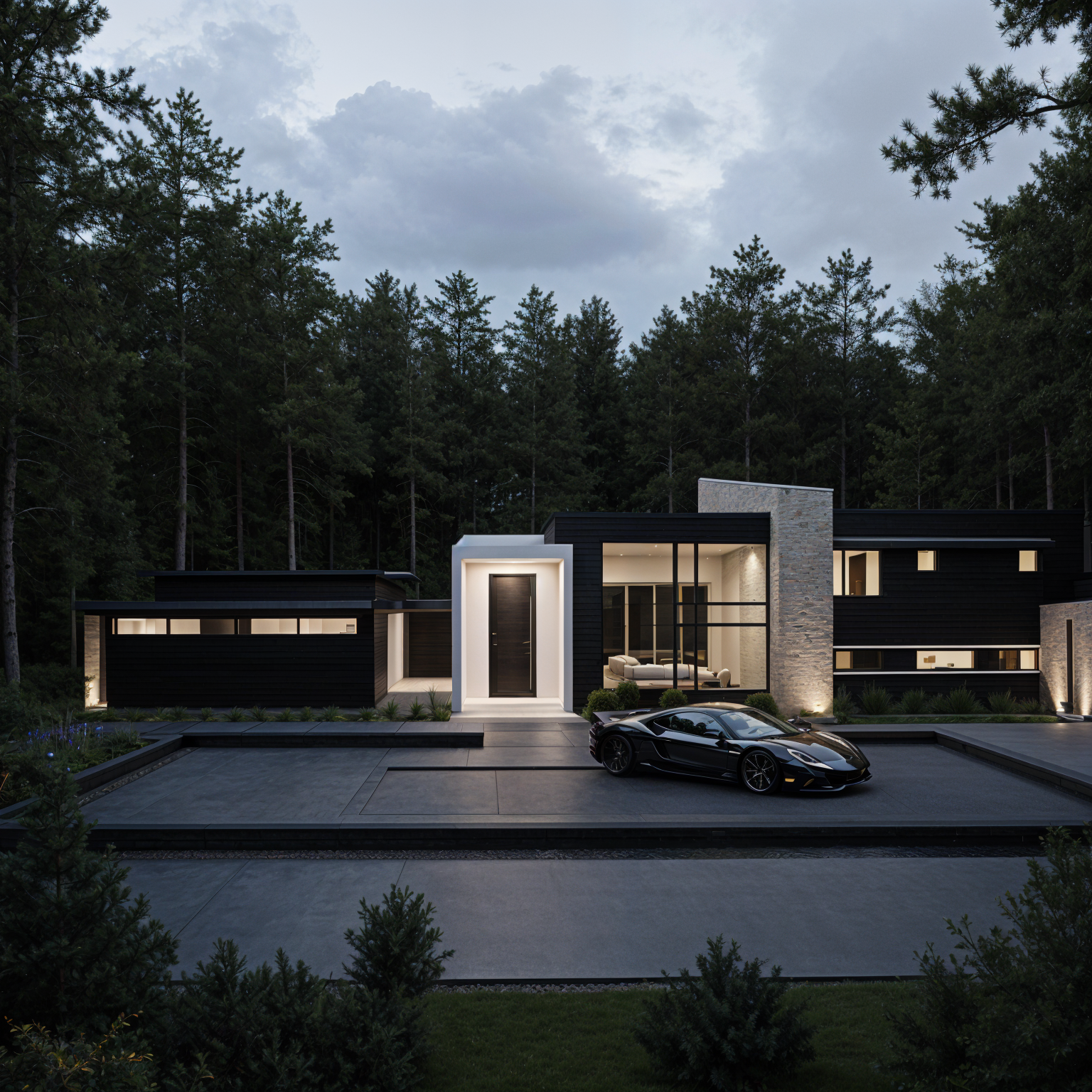 modern house in the woods black brick motor court with asphalt and ferrari car exterior lighting black horizontal siding stone facade white elements modern landscape full glass front door person perspective