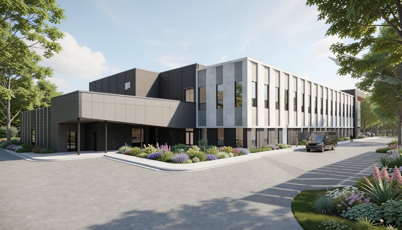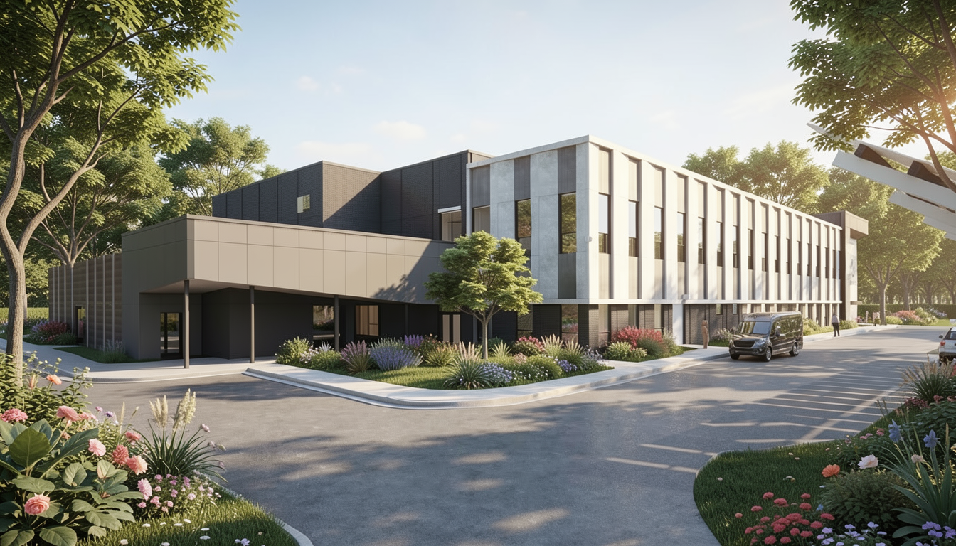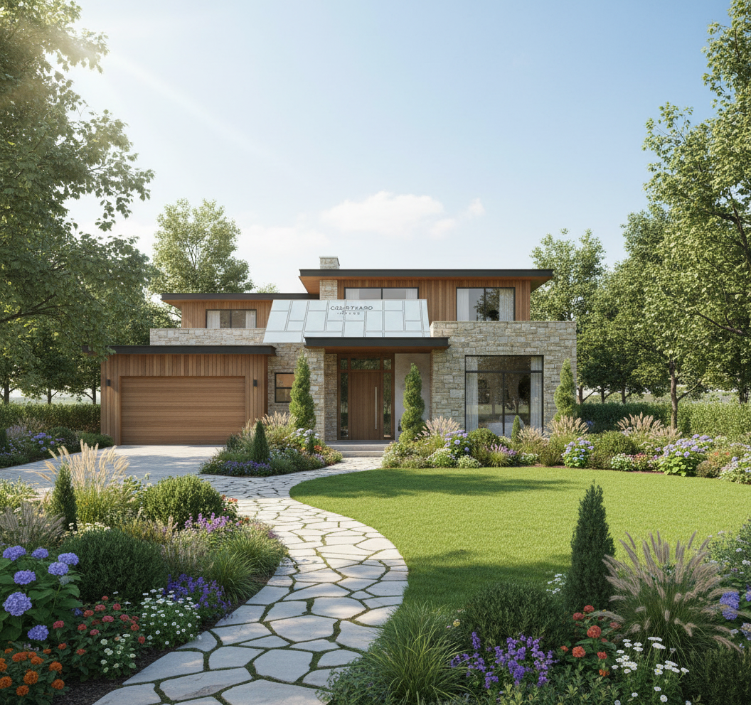 a manicured lawn layered flower beds low maintenance shrubs native plants stone pathway leading to the entrance