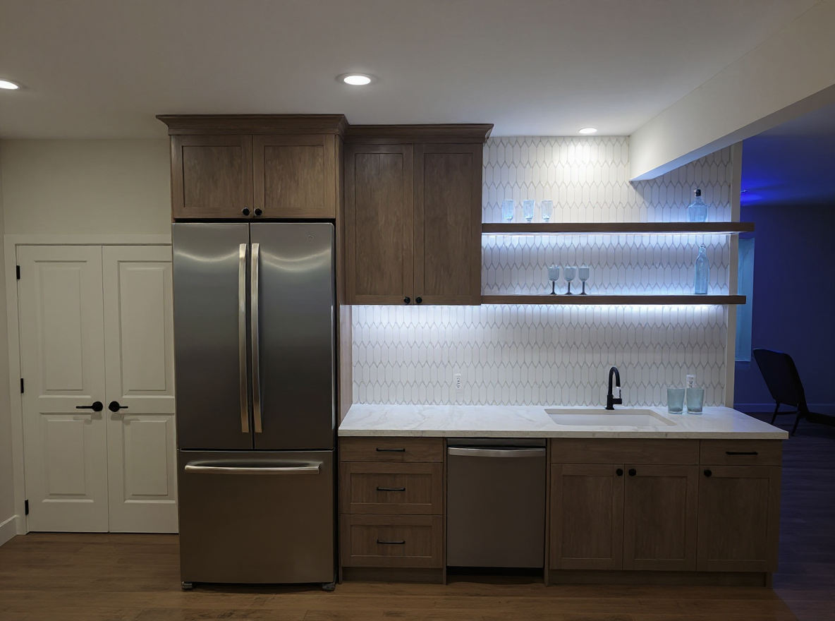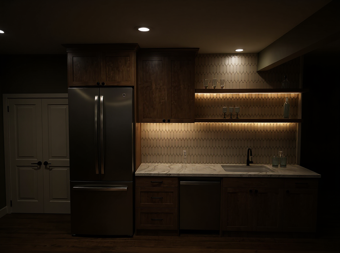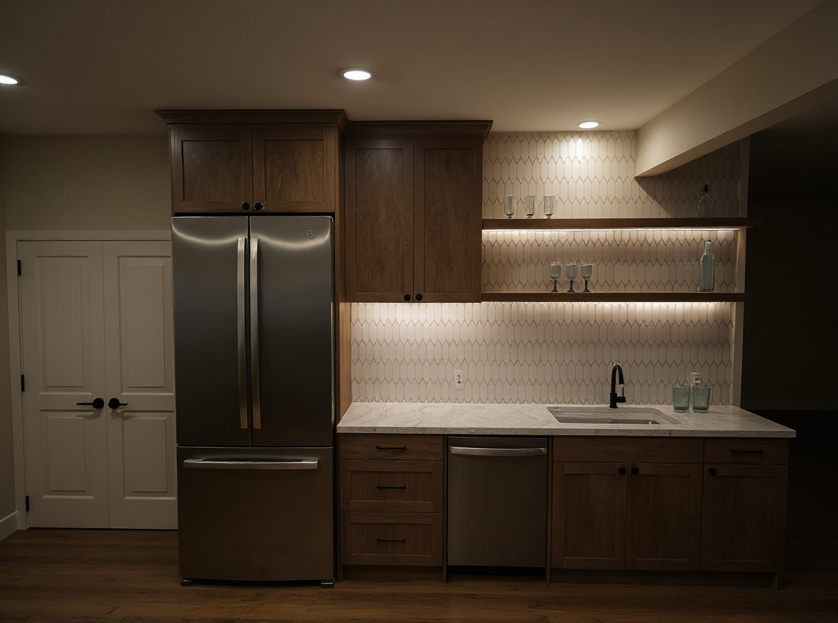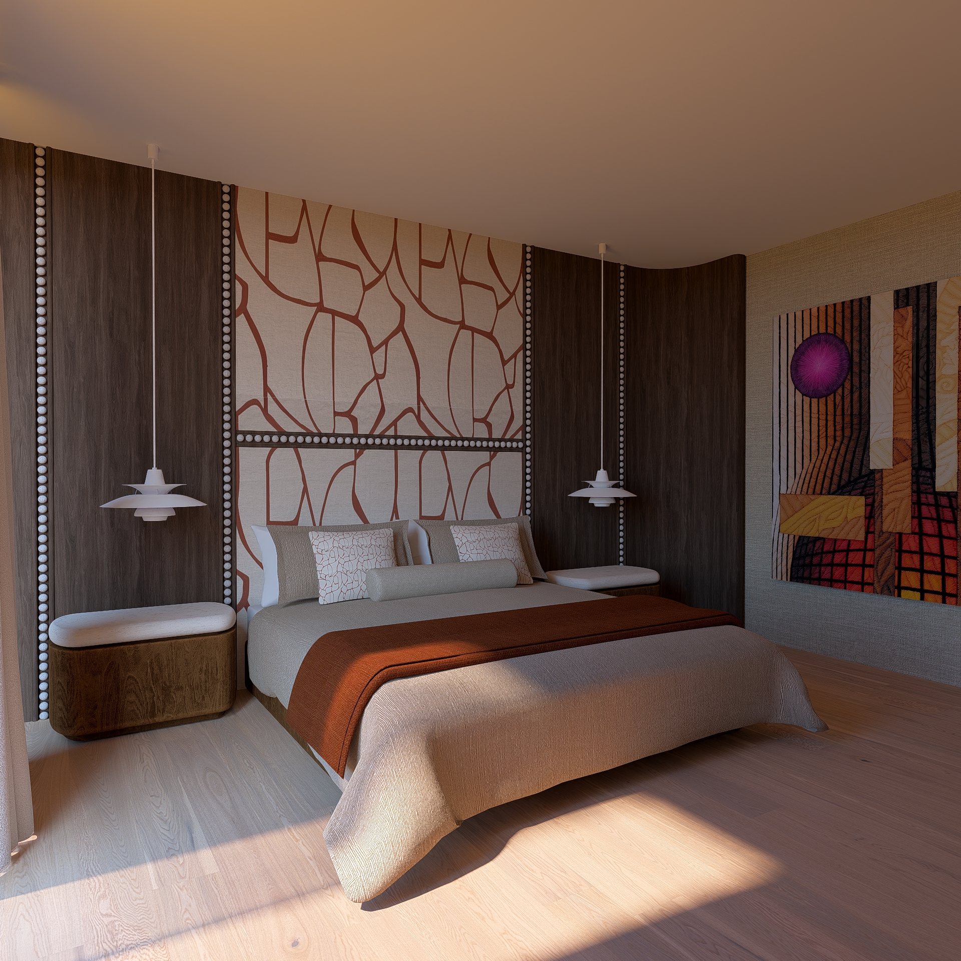 add an asymmetrical rounded edge beige carpet placed under the bed
