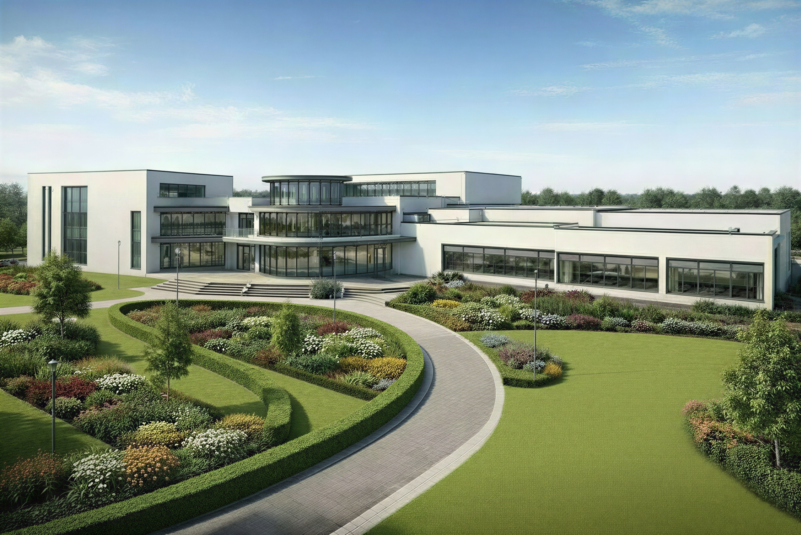 i need to remove the garden style landscaping in the lower left of the image showing only lawn leave the drive and building as is