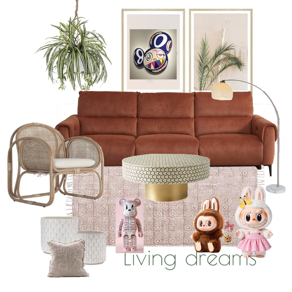 create a spacious comfortable and modern living room place a comfortable dark rust colored sofa in the center of a clean white backdrop place a light green round coffee table with a gold base in front of the sofa to the left place a natural woven rattan chair with lightweight cushions hang a lush green spider plant above the sofa add several large framed paintings one with a bold colorful abstract pattern and another with an elegant palm frond motif place a warm gold floor lamp with a soft white shade next to the sofa cover the floor with a soft pink patterned rug add interest with whimsical soft toys in shades of pink and brown scatter textured cushions in white and gray around the living room for a cozy and inviting atmosphere