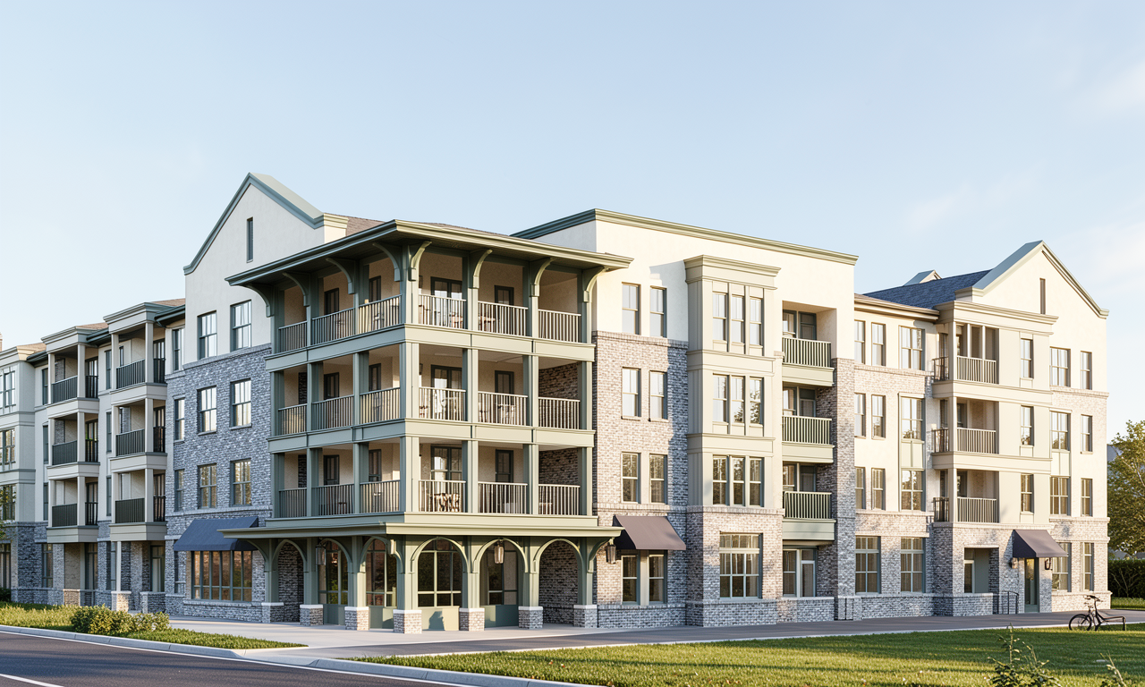 daytime rendering with a brown brick light stucco and historical gray green trim