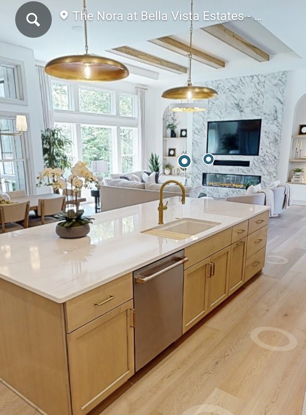 remove the beams from the ceiling add crown around the ceiling and in the tray make the windows black make the island white oak with a waterfall countertop make the floors european white oak make the fireplace look like the reference image make the floors european white oak flooring