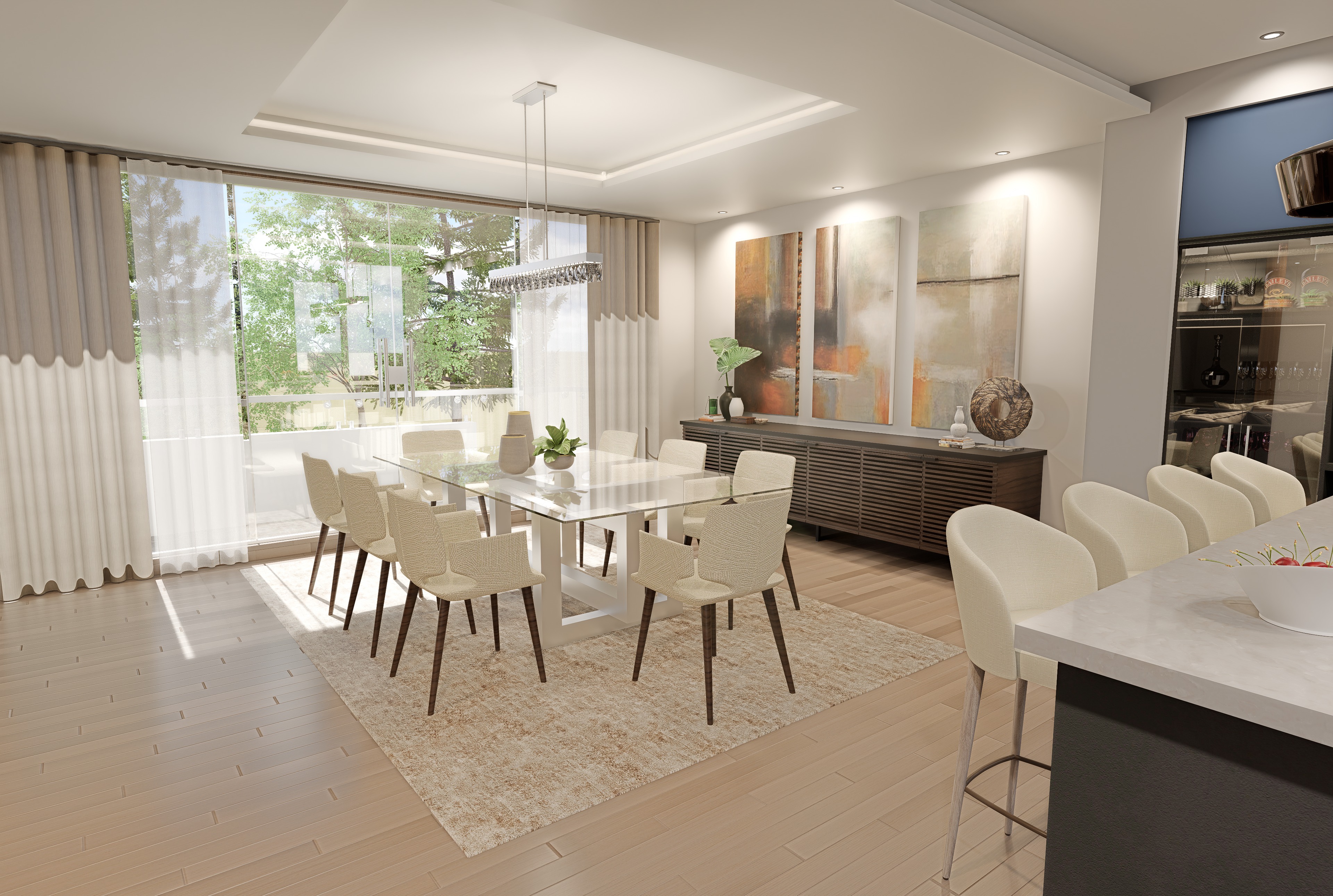 photorealistic rendering of an open concept dining room with a contemporary and elegant interior design the space is illuminated by soft natural light entering through a floor to ceiling window with white translucent curtains and side panels in cream and taupe tones