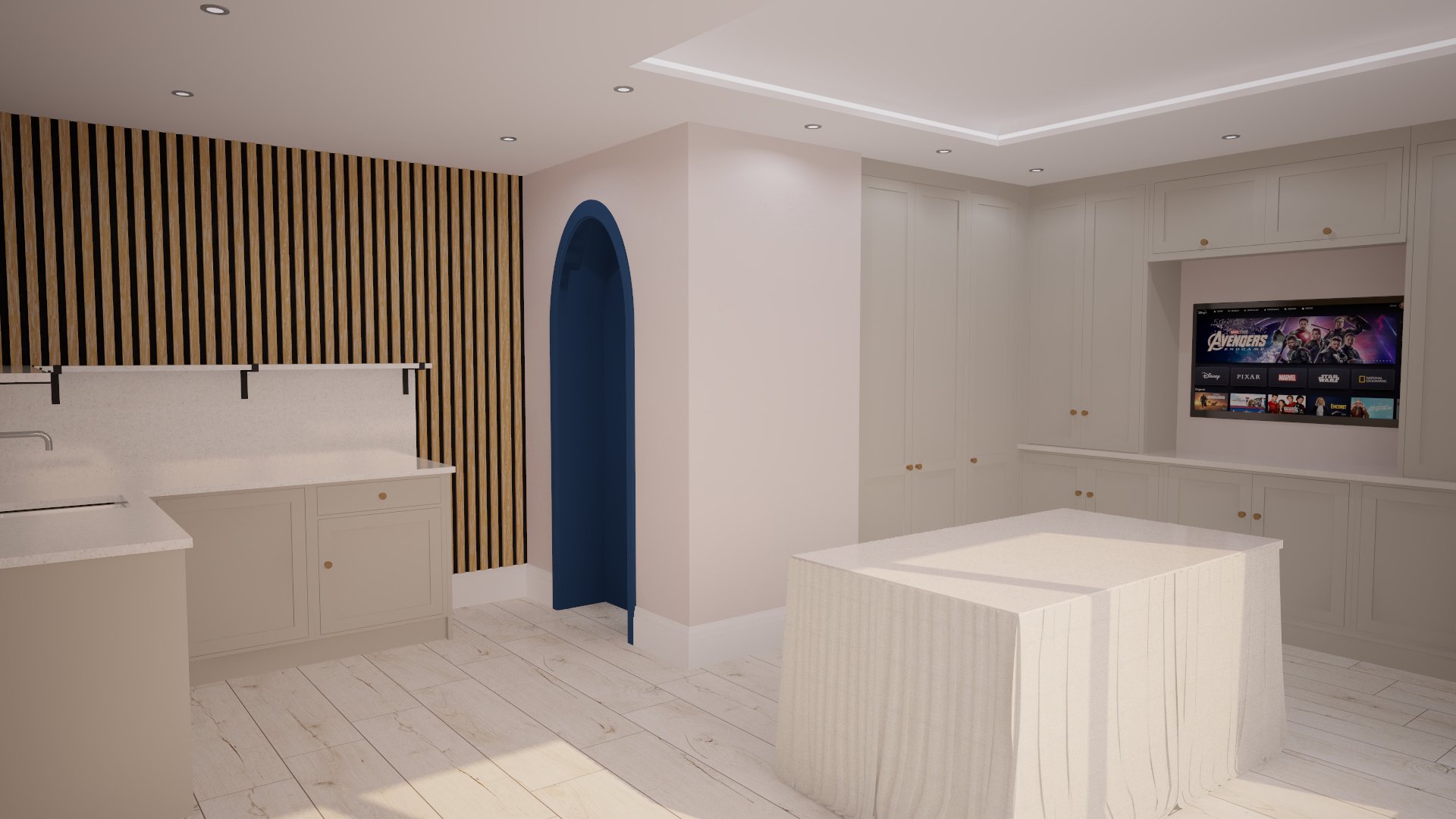 render shop keeping existing features folded fabric with scissors for cutting for on centre table tidy mugs and drinks accessories on shelf to left