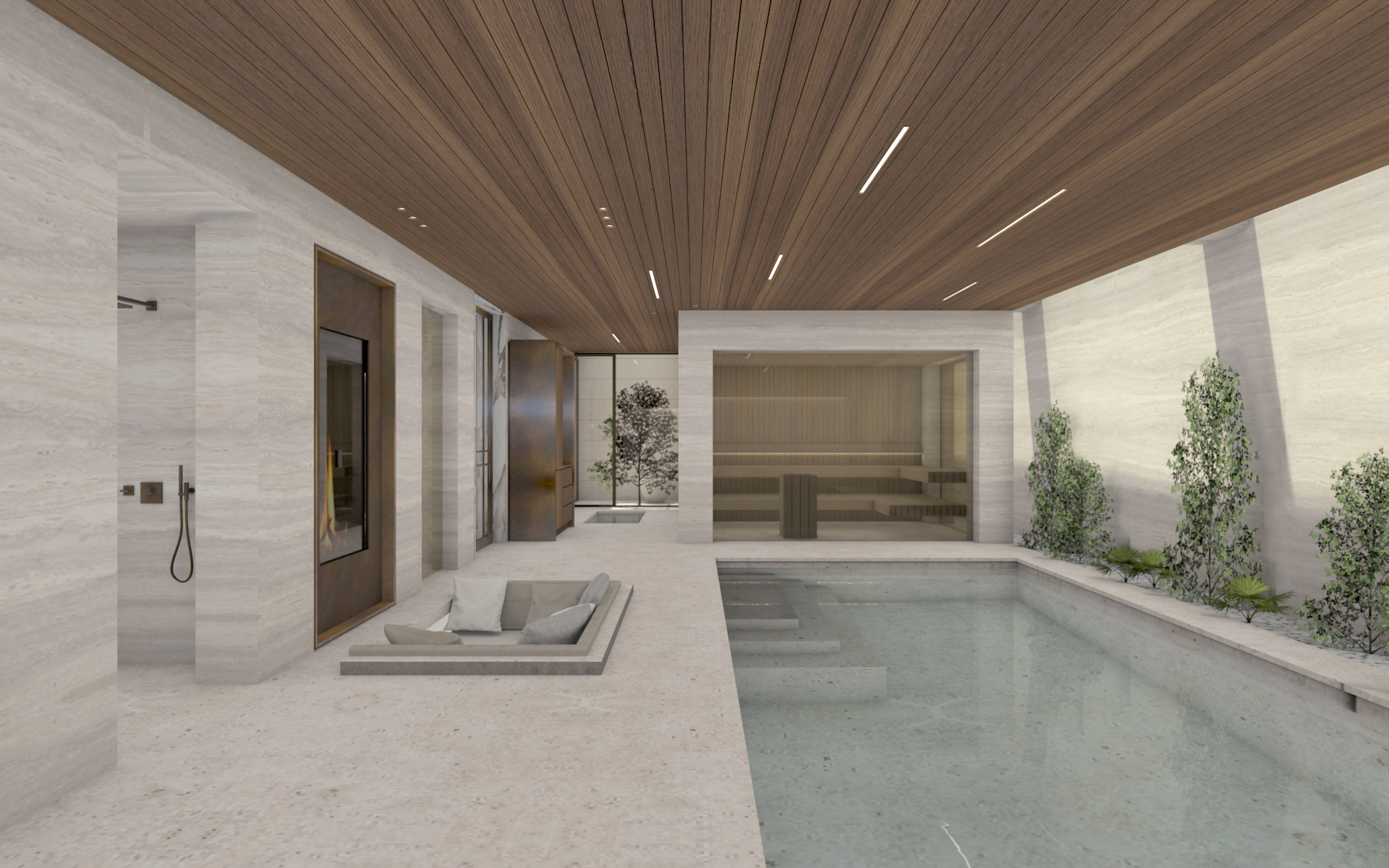 render a luxurious indoor pool space with a serene and modern atmosphere seen out of a sauna the ceiling is made of rich wooden panels in warm light brown tones creating a cozy ambiance the walls and floors are crafted from sleek beige travertine slabs adding an elegant touch the pool water is crystal clear with a hint of turquoise reflecting the soft natural dimmed light include lush green plants only at the right side of the big pool placed in white pebbles for a refreshing touch of nature the small pool at the back of the left is a cold water bath in the back on the right a sauna a minimalist seating area with soft gray cushions to enhance comfort and relaxation in front of the fireplace in the wall overall aim for a peaceful and sophisticated spa like environment