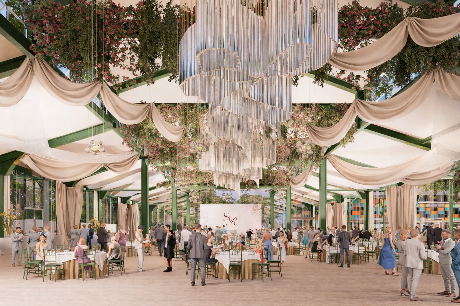 modernist exterior shot please delete the drapes on the walls and retain the drapes on the ceiling architecture