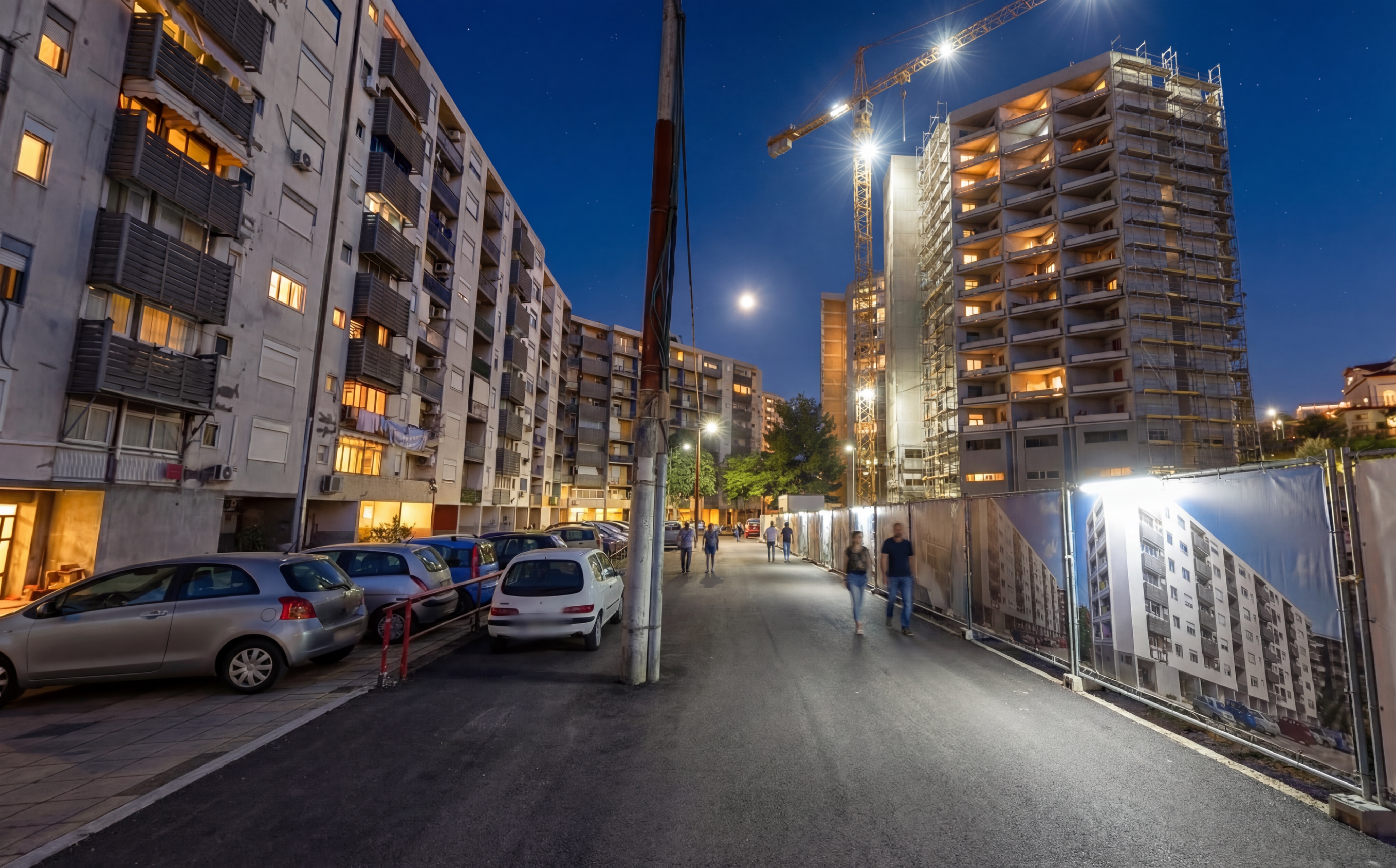 rimuovi la gru dall immagine inserisci gru sul lato destro del palazzo creami questa stessa immagine con ambientazione diurna estiva