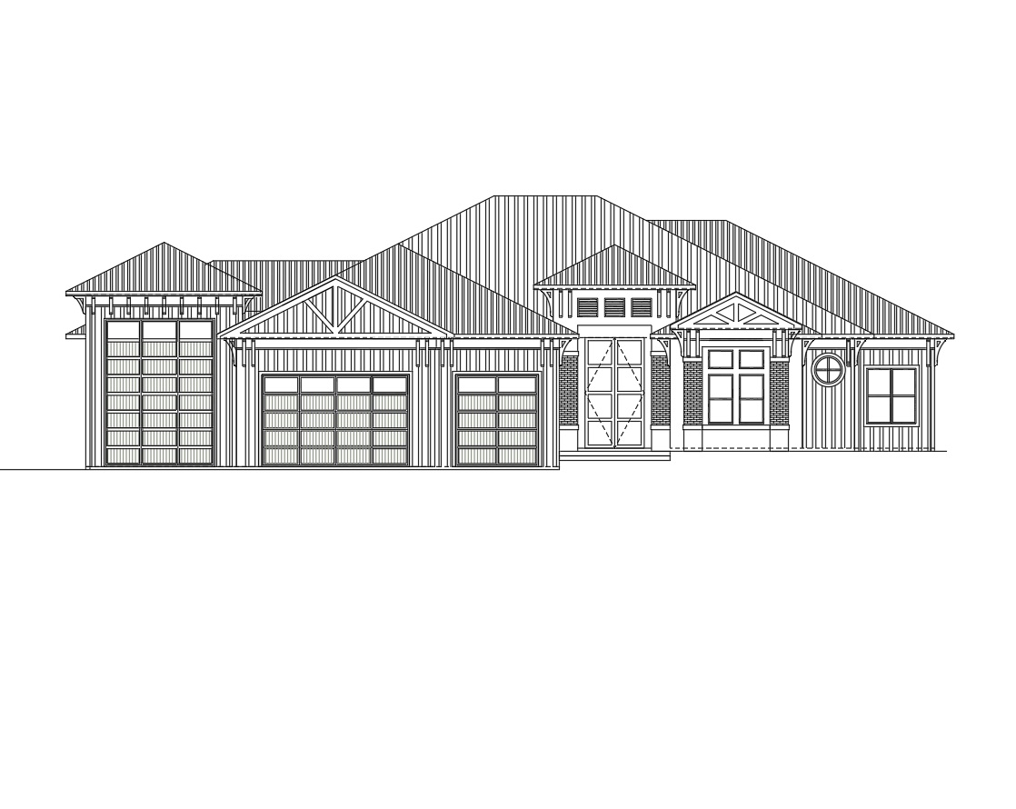 create a photorealistic rendering of a luxury coastal modern residence with a bright white board and batten and with metal dark gray roofing the exterior has board and batten the front accent columns have a gray color marble accent the foyer entrance is white only the columns are cladded with marble gray accent the upper portion of the foyer entrance have 3 bahama shutters in white the garage doors are classic wood light gray color exposed trusses are in white color the brackets are also white show a big garden in front provide a driveway for the 3 garages show a wide stone paver driveway in warm gray tones leading to the home surrounded by lush greenery in florida setting surround it with palm trees and a dawn setup with lights lit up and the house shows