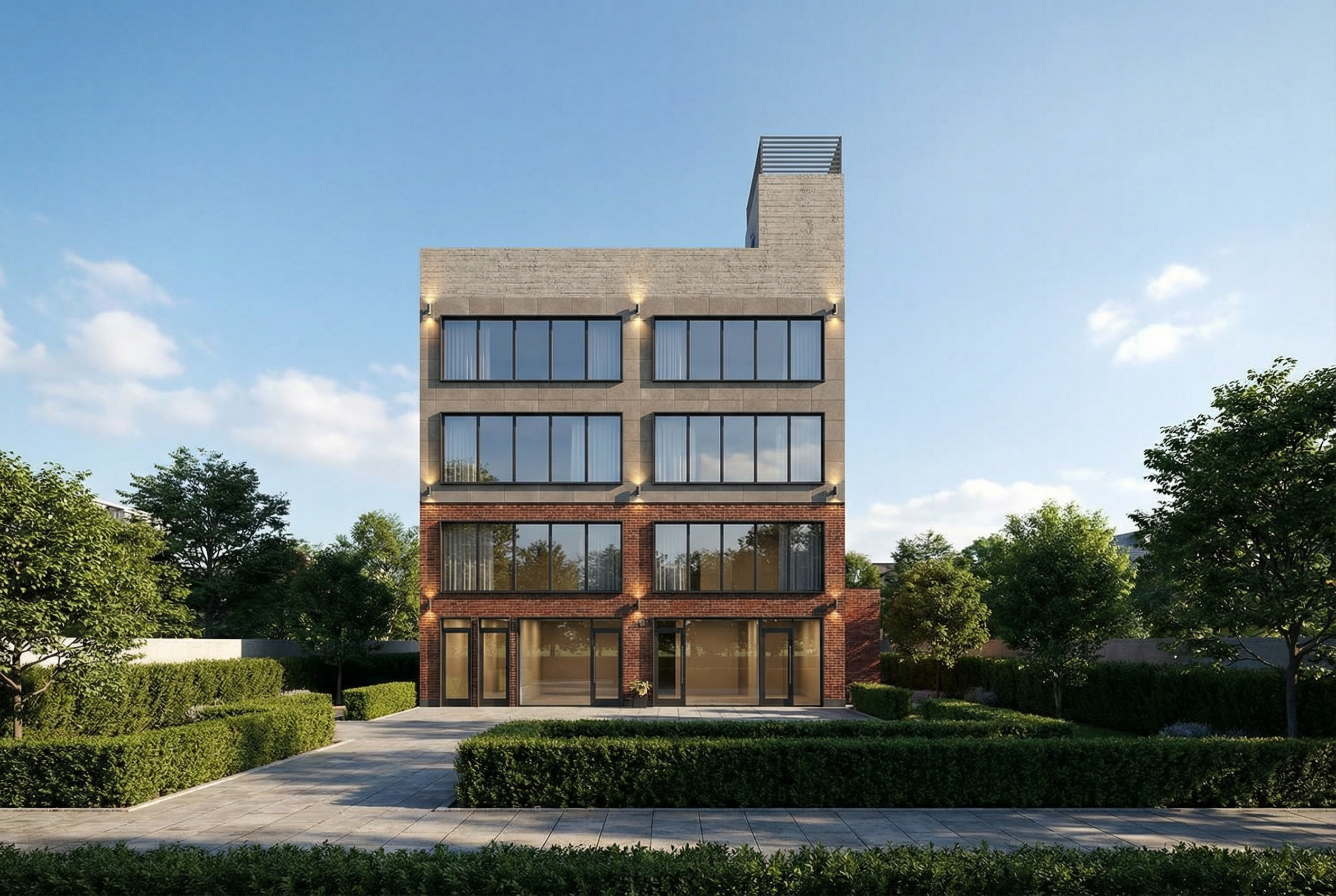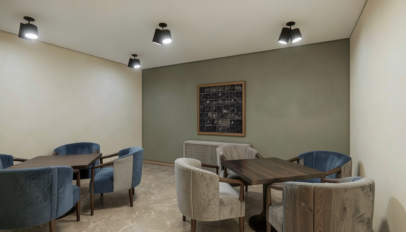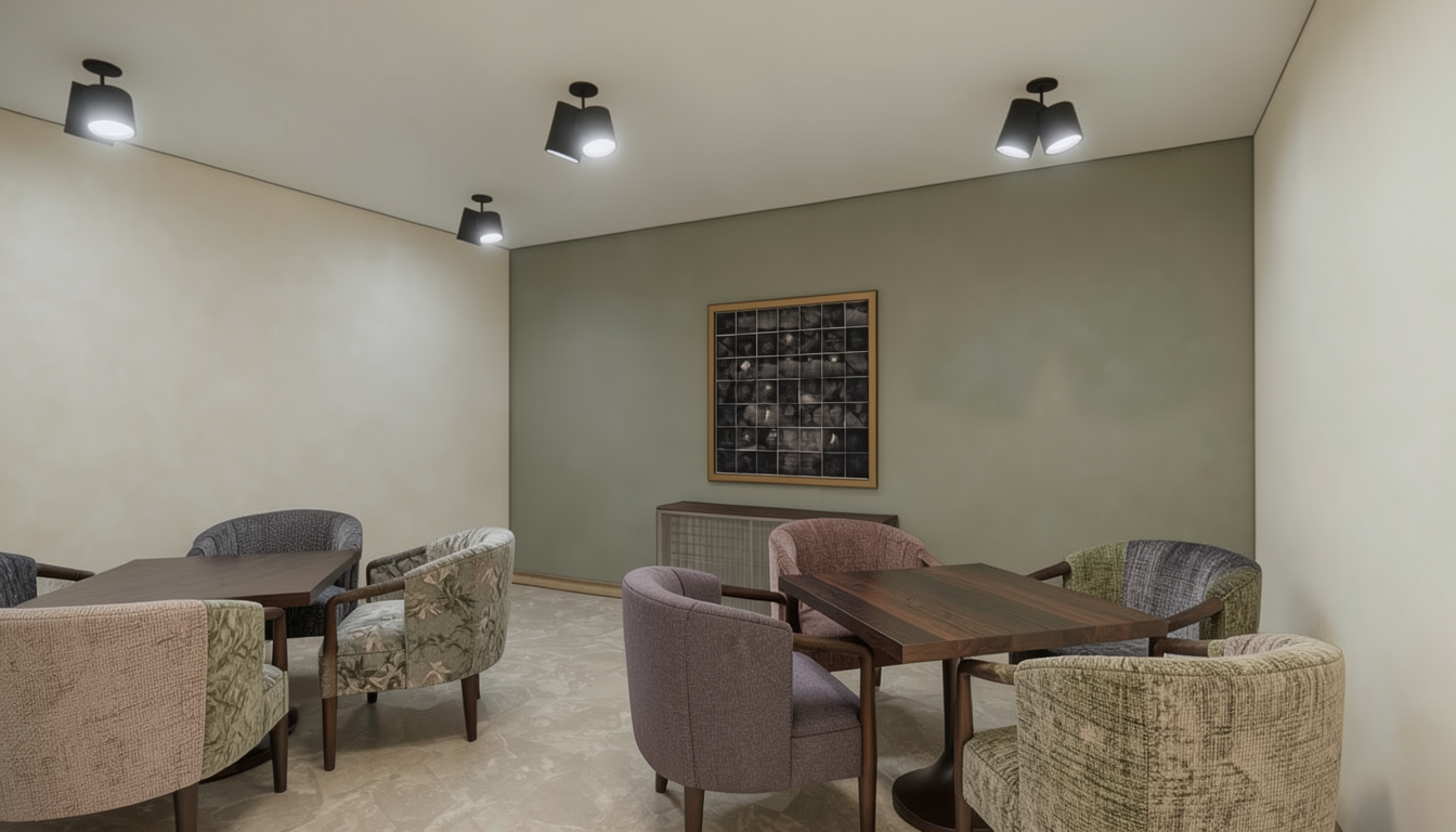 enhanced interior lighting white quartz slab countertop same white quartz slab 6 inch backsplash two porcelain undermount sinks brass deck mount faucets small mosaic limestone tile on floor natural wood white oak flat cabinetry with brass hardware tan plaster on walls wood trim around opening on left with tall paneled wood header all darker than the cabinetry full width mirror above sinks 3 evenly distributed skinny cylinder frosted glass sconces with one of them centered in ceiling lights in soffit above sinks soft accent lighting underneath the mirror natural medium brown wood flooring beyond threshold on left same darker natural medium brown wood tall baseboard remove faint text box in bottom left corner