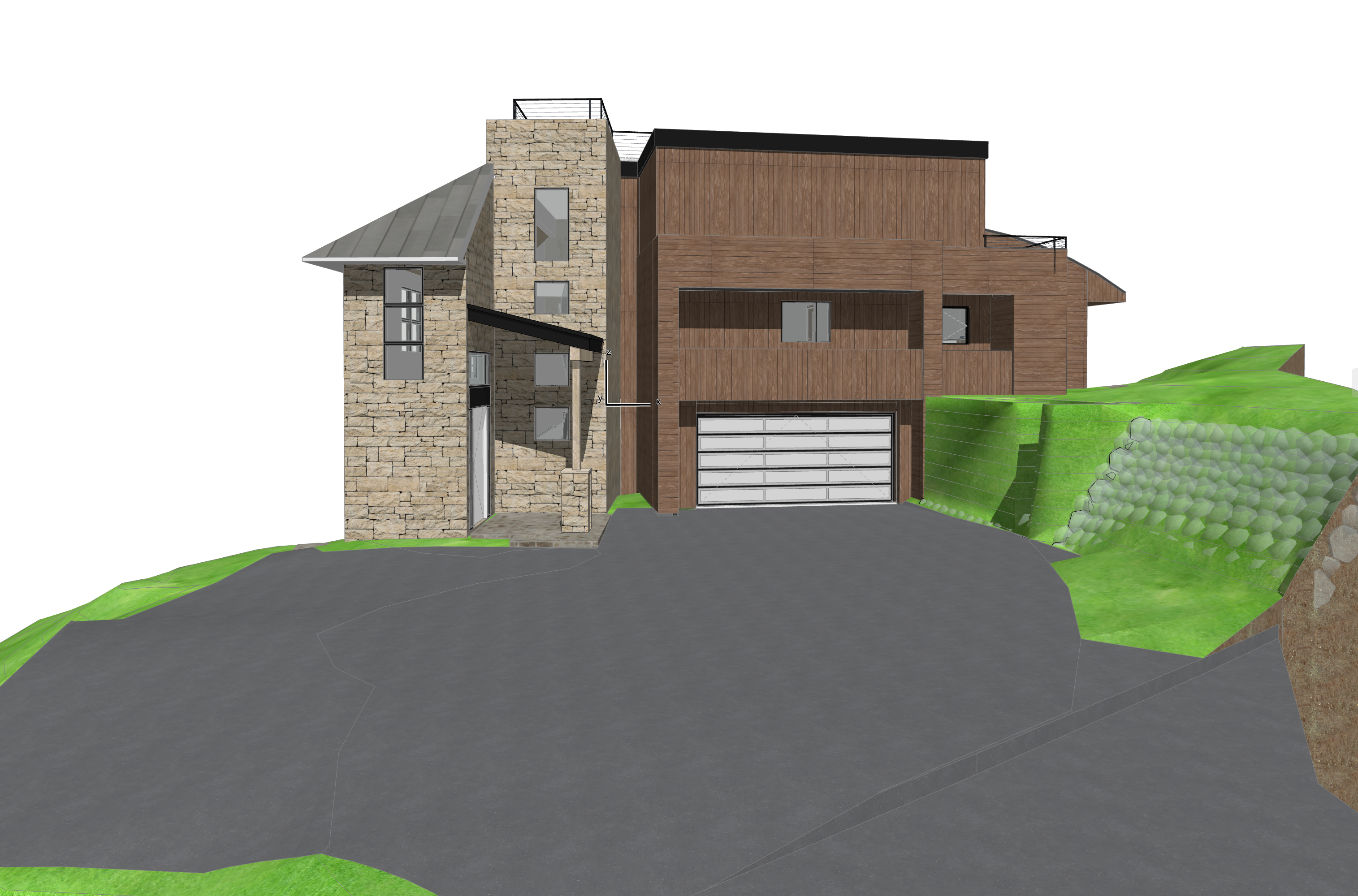 do not change the view only enhance the current materials and make the landscape nicer vegetation detailed textures in the wood siding and glass reflections and a vibrant clear sky with light atmospheric depth render in hyper realistic architectural visualization quality 8k resolution render a photorealistic 3d perspective of this house in a snowmass co reference the current material style just enhance them brown standing seam metal roof vertical and horizontal clear vertical grain contemporary not rustic cedar wood siding and colorado buff rough face limestone walls where shown keep model geometry the same windows doors roof walls garage door pavement driveway make a lush vegetation that looks native to snowmass co