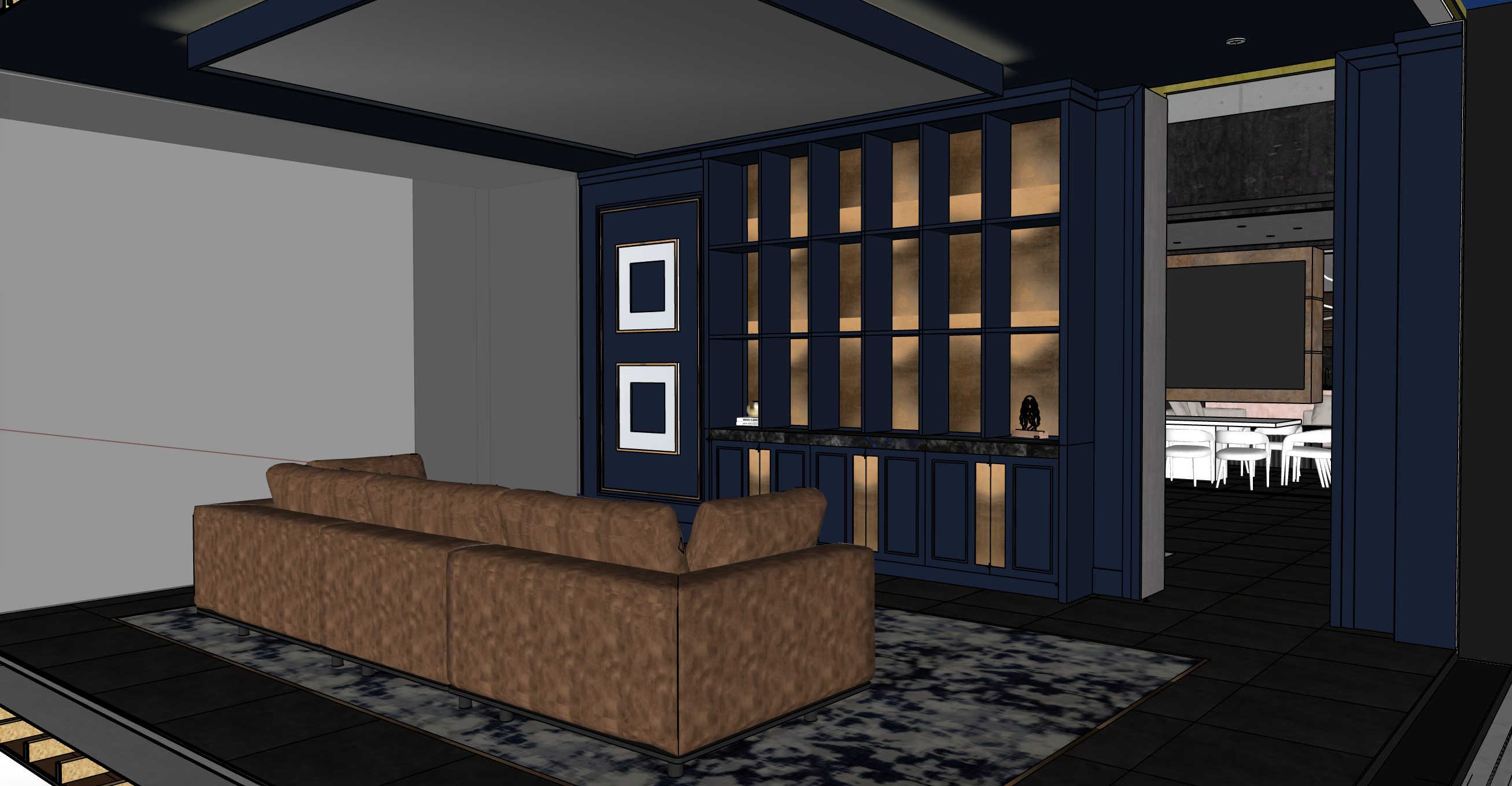 night time accent lighting in shelves camel leather sofa black and white photos in frames mirror on underside of drop ceiling structure maintain deep blue color on walls and cabinets with gold accents emphasize molding details tint large window in back with less opacity now window mullions moody library vibe