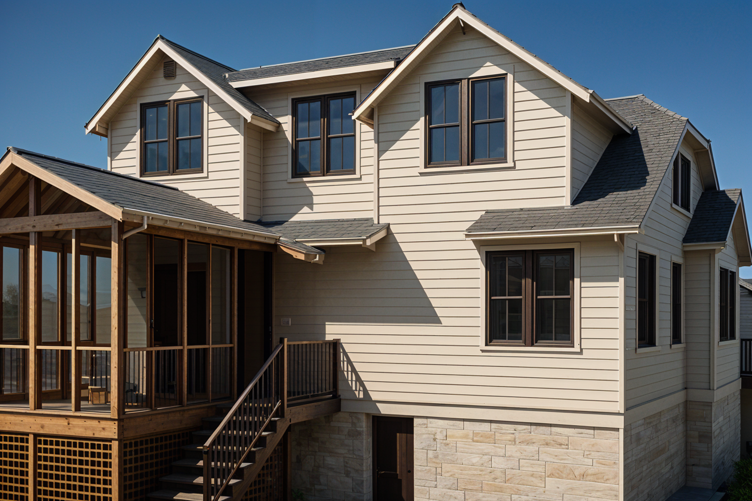 rustic modern house with dark gray metal roof and charcoal black siding accented by warm wooden beams and natural stone base wide welcoming wooden doors with clear glass panels overcast sky with soft neutral tones creating a serene and cozy atmosphere surrounding landscape of subtle greens and tans evoking a calm and peaceful rural setting