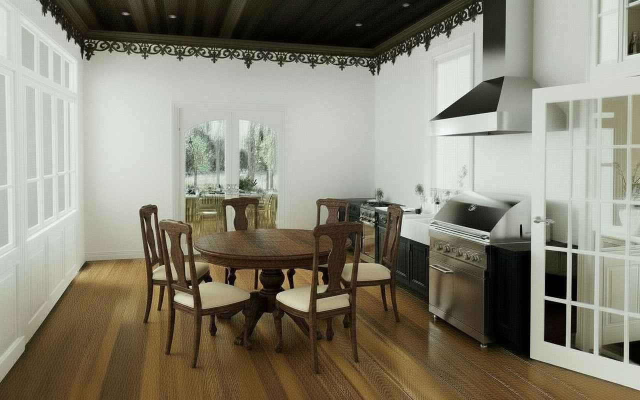 make the ceiling blue wood wiht white trim and details the floor should be blue tile make the door a closed patio door