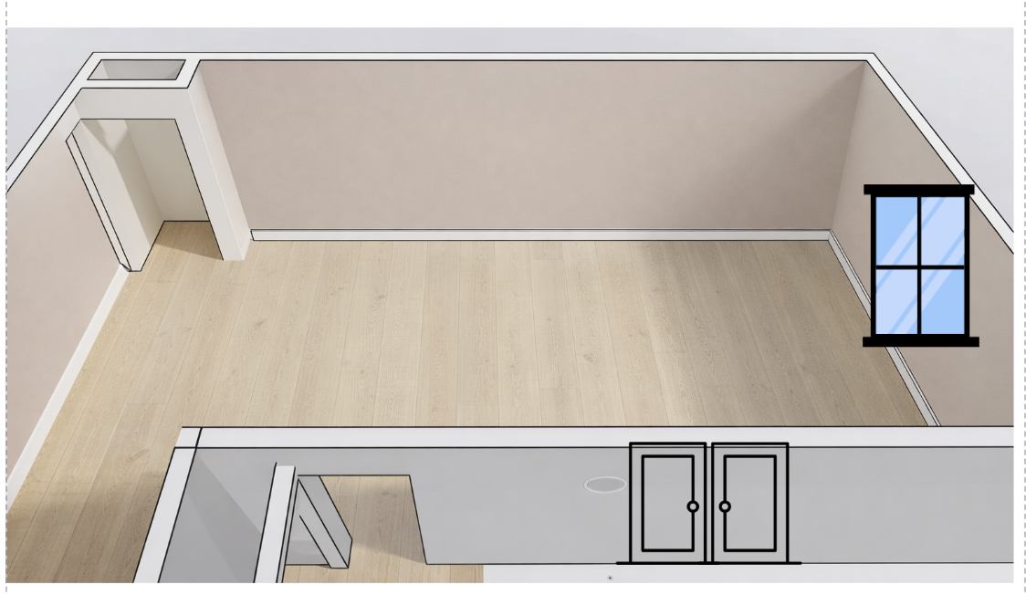 make the outline doors realistic doors and the wall with the window on it remove that window and make floor to ceiling window opening on that wall