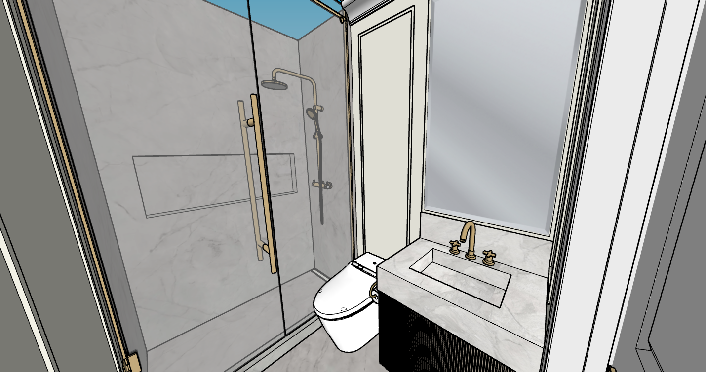 render the image add a ceiling with a pot light in the shower and a pot light in the bathroom the shower wall tile and the bathroom floor is marble trend natura super white the countertop is a white limestone the vanity is benjamin moore hc 166 painted ribbed the walls and ceiling are benjamin moore chantilly lace add and led light around the mirror