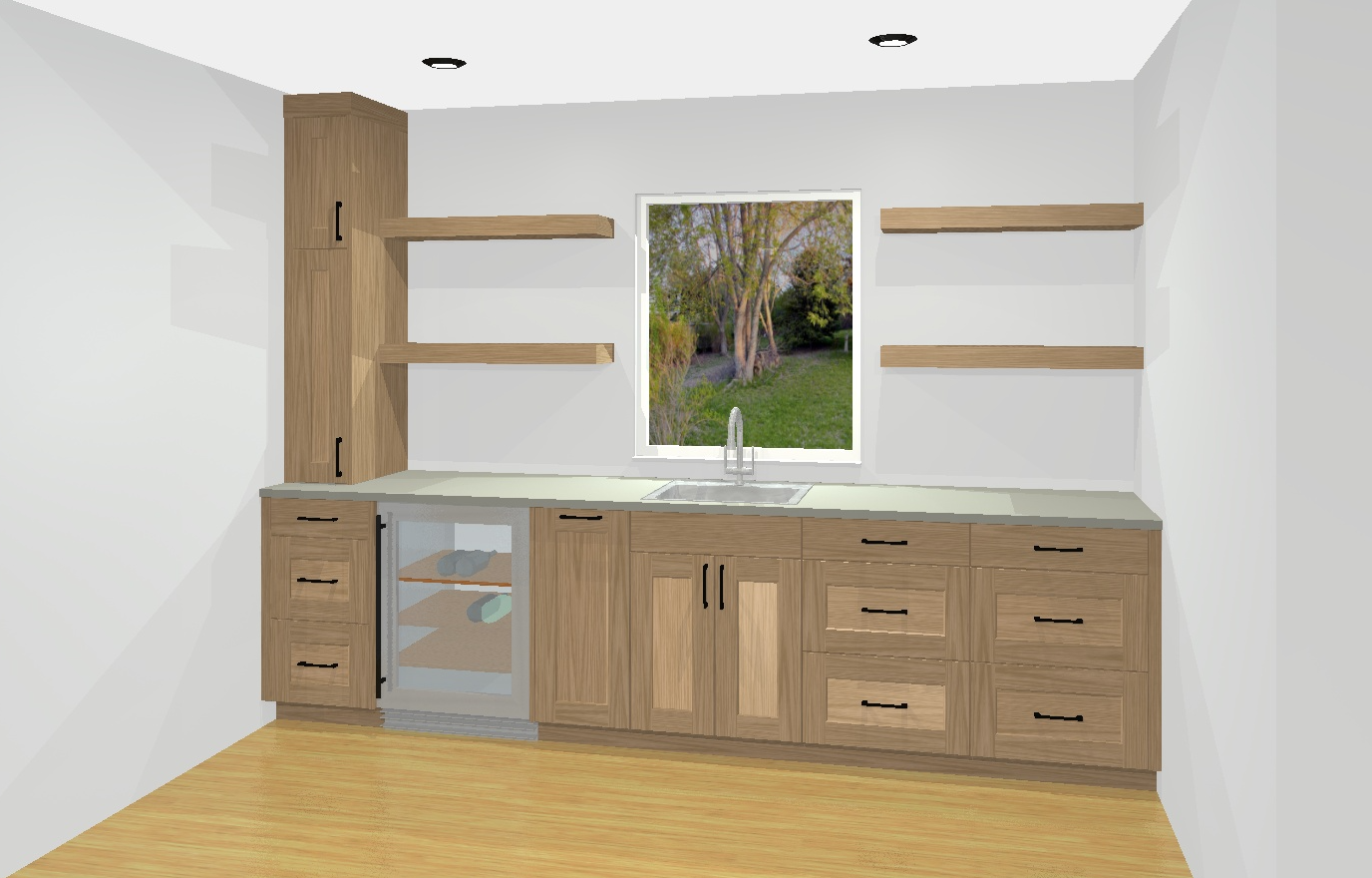 a modern bar with sleek design featuring upper and lower cabinets in matte dark grey with black handles the countertops are darker gray granite providing a sophisticated contrast the sink is a sandy grey color and faucet is polished nickle adding a touch of elegance shelves are made of light oak wood giving warmth to the space the floating shelves also have led lighting the walls are painted soft dove gray for a calming backdrop recessed ceiling lights cast a warm ambient glow creating a cozy and inviting atmosphere the overall feel is contemporary stylish and functional