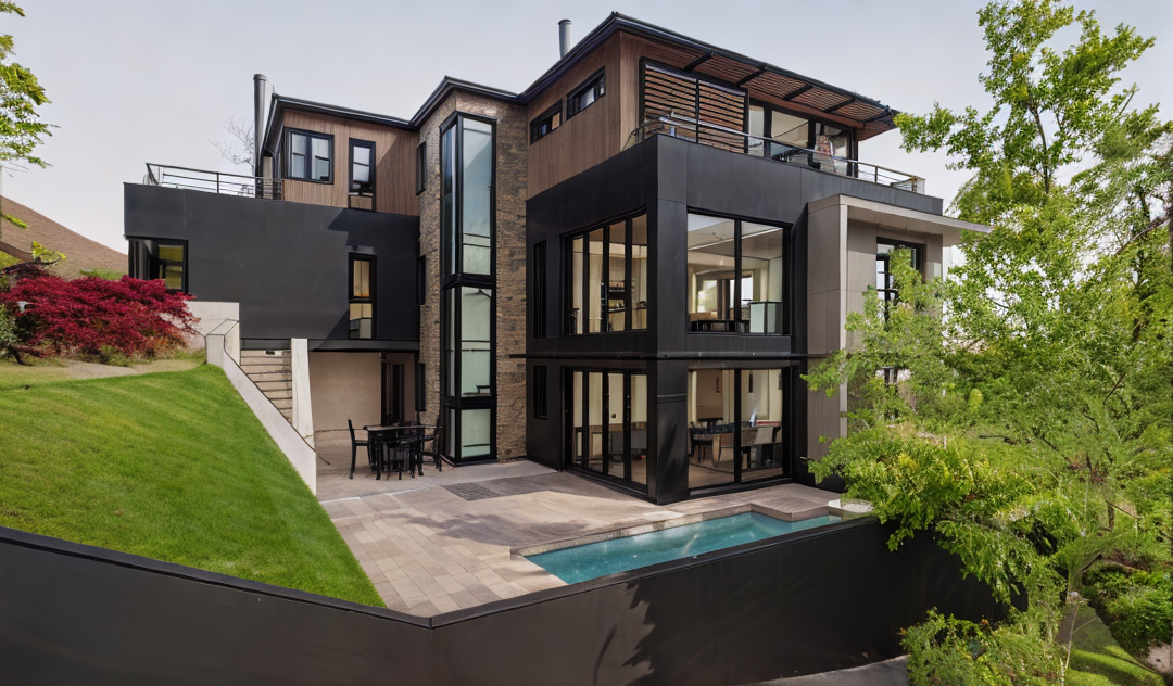 contemporary perspective shot florida modern architectural style house tropical lush landscape south florida style locate the house in a typical florida neighborhood on a beautiful sunny day use typical modern florida textures and colors show the neighboring houses on both sides dark windows trim fascia soffit corbels curvy railings backyard scene architecture