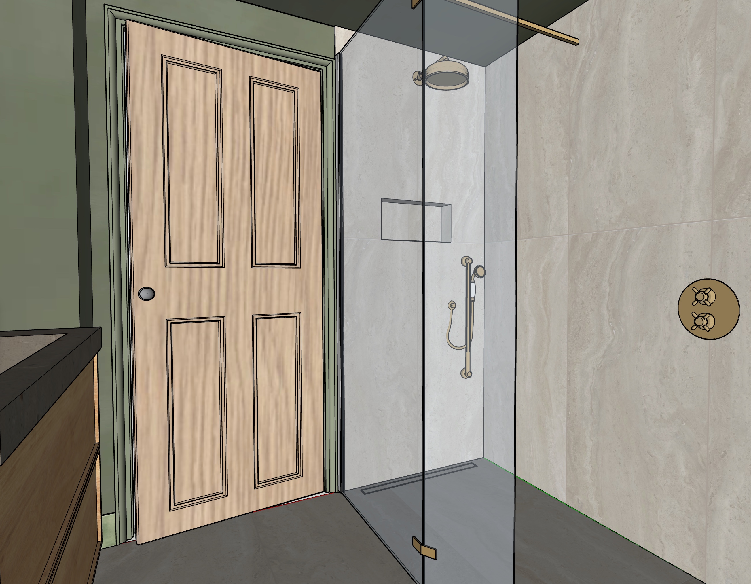 create a render in hyper realistic architectural visualization quality 8k resolution all objects furniture sanitary ware and architectural features must remain in place do not add any objects or delete anything from the image the spatial configuration must remain unchanged warmth gentle reflections soft shadows enhanced color richness and luxurious level realism improve depth and realism through wood grain richness brass highlights fabric texture and polished clarity while keeping the entire scene exactly as originally designed use general daylight lighting in the room the wall covering and floor should match a travertine tile the door is oak and the walls painted green as per the reference image