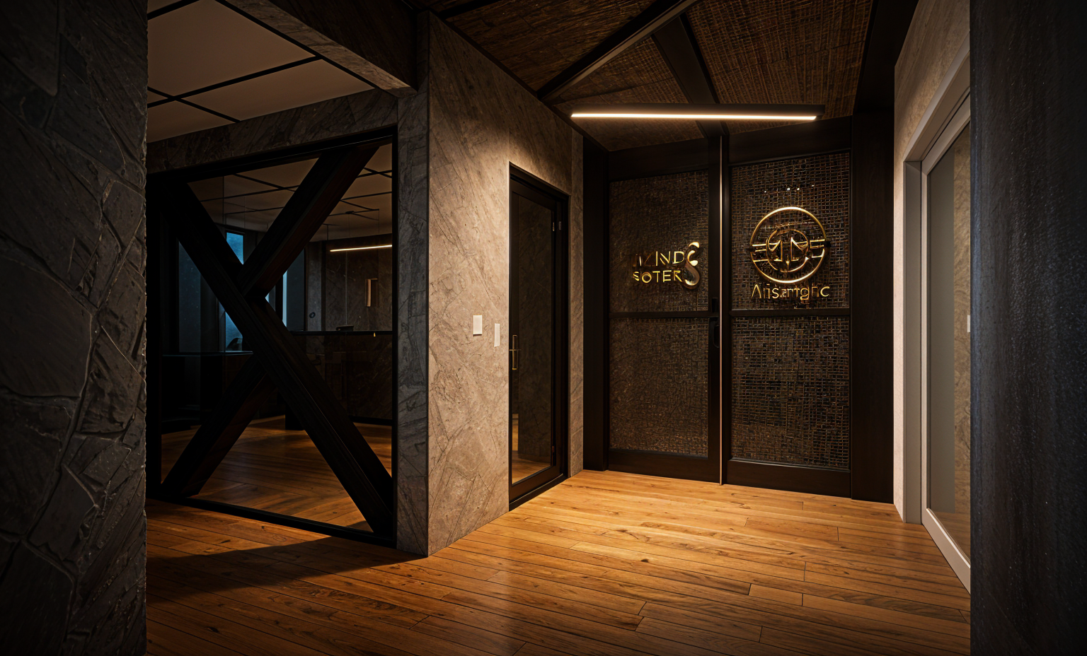 blue led light along x shape 3 vertical led light bars behind mesh screens morning sun coming into space light and spacious