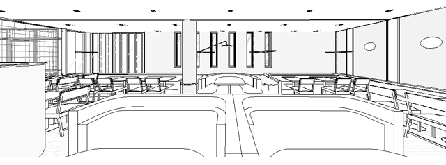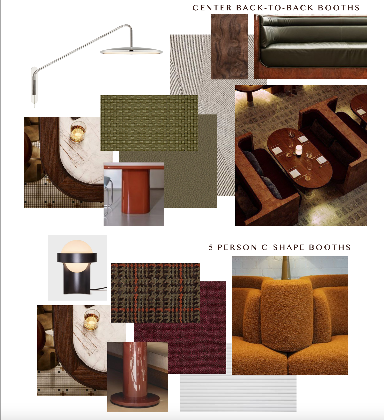 interior shot the back wall of the image should be a tan and light grey rock wall that has varying degrees in size color shape depth and texture of stone and is not uniform the ceiling should be a light tan lime washed finish with lots of variation in texture the large round column should be a light tan combed plaster the large round booth in the center should be the red and plaid pattern material shown in the mood board the banquets should be the green materials shown in the modoboard the round booths closest to the image persepctive should be based upon the green and wood image shown in the mood board and have the high gloss red table bases and a marbe and wood top as shown in the mood board image there should be no orange whatsoever in the iimage