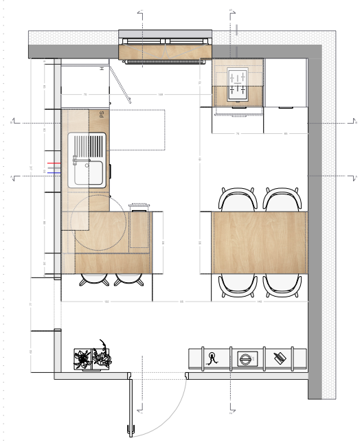 convert this floor plan into a realistic isometric 3d view of a full house show the space from an elevated angle with furniture walls and details visible plan of the kitchen add realistic lightning and accessories the counter top and upper cabinets are oak cover all other fronts are white also the walls are white the backsplash in also oak the wood is light make it feel homey use the same furniture as shows on the plan do not change the orientation of the floorplan