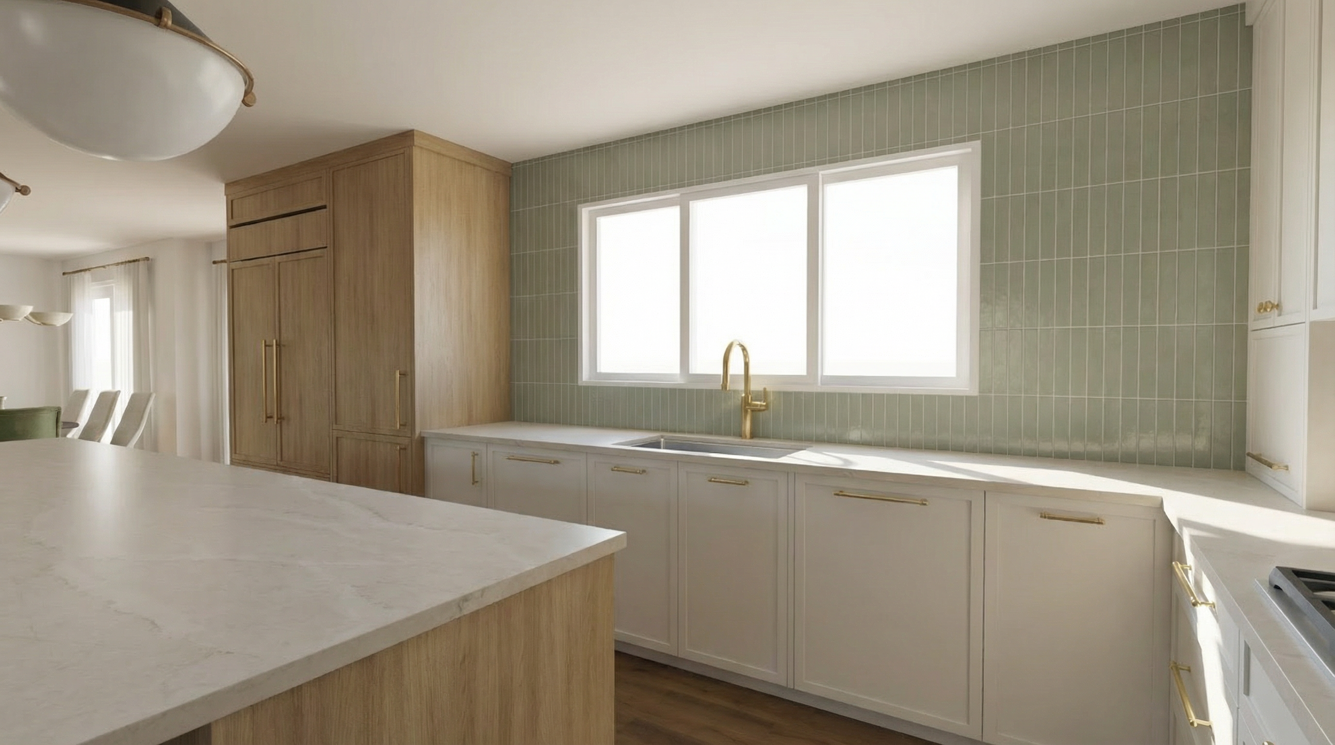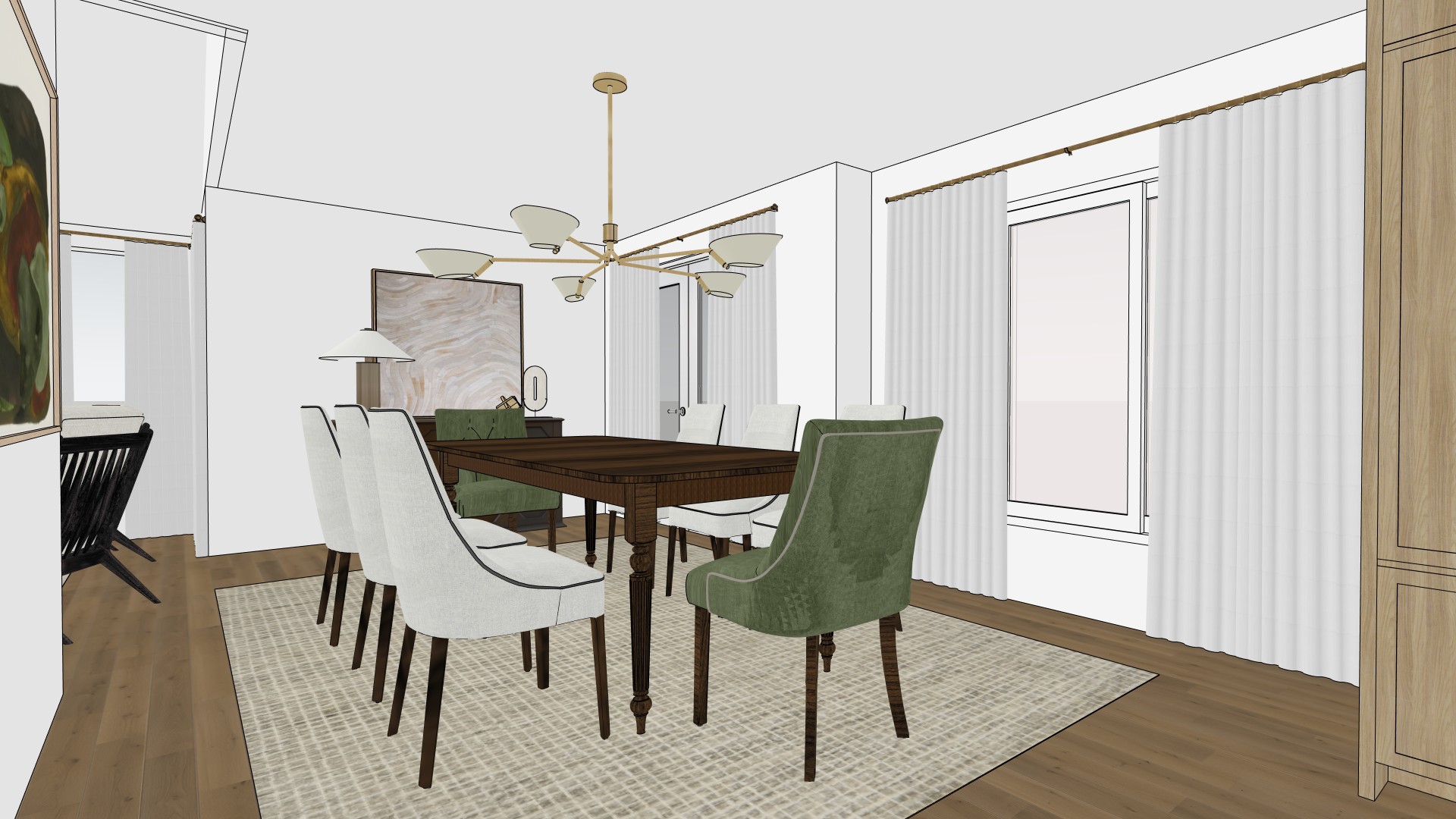 ultra realistic interior dining room rendering shown from a wide angle perspective that captures the entire dining area including the table seating lighting windows and surrounding architectural elements the dining space is centered around a rectangular solid wood dining table finished in a medium to dark warm wood tone with visible grain and a matte finish the table has a substantial presence with clean edges and traditional detailing anchoring the room visually seating consists of eight upholstered dining chairs arranged symmetrically around the table most chairs feature light neutral fabric upholstery with subtle texture and dark wood legs while two accent armchairs at the head positions are upholstered in a muted olive green fabric adding depth and contrast all chairs share consistent proportions and refined silhouettes above the dining table a central chandelier is suspended from the ceiling the fixture features a brushed brass structure with multiple arms extending outward each supporting a soft off white upward facing shade creating a balanced sculptural focal point the dining area is grounded by a large light toned area rug with a subtle woven pattern placed beneath the table and chairs defining the zone and softening the wood flooring the room is enclosed by white walls and large windows with white trim dressed with full height white drapery panels hung from slim brass curtain rods allowing soft diffused natural light into the space in the background a wood sideboard or console is visible finished in a coordinating warm wood tone above it hangs a large framed artwork with abstract organic patterns in soft neutral tones a table lamp with a light colored shade sits atop the console adding a secondary layer of ambient lighting the flooring throughout the dining room is medium tone natural wood planks laid lengthwise consistent with the rest of the home and harmonizing with both the dining table and surrounding cabinetry wood tones lighting is soft even and neutral consistent with architectural visualization standards the overall aesthetic reflects a sketchup style architectural 3d render characterized by clean outlines simplified geometry crisp edges and flat yet realistic materials maintaining accurate proportions and a calm uncluttered composition no elements are added or altered the scene remains fully faithful to the original image