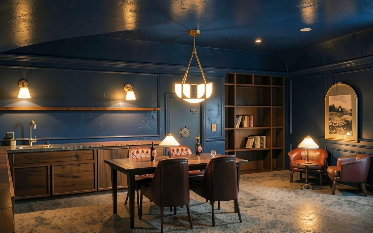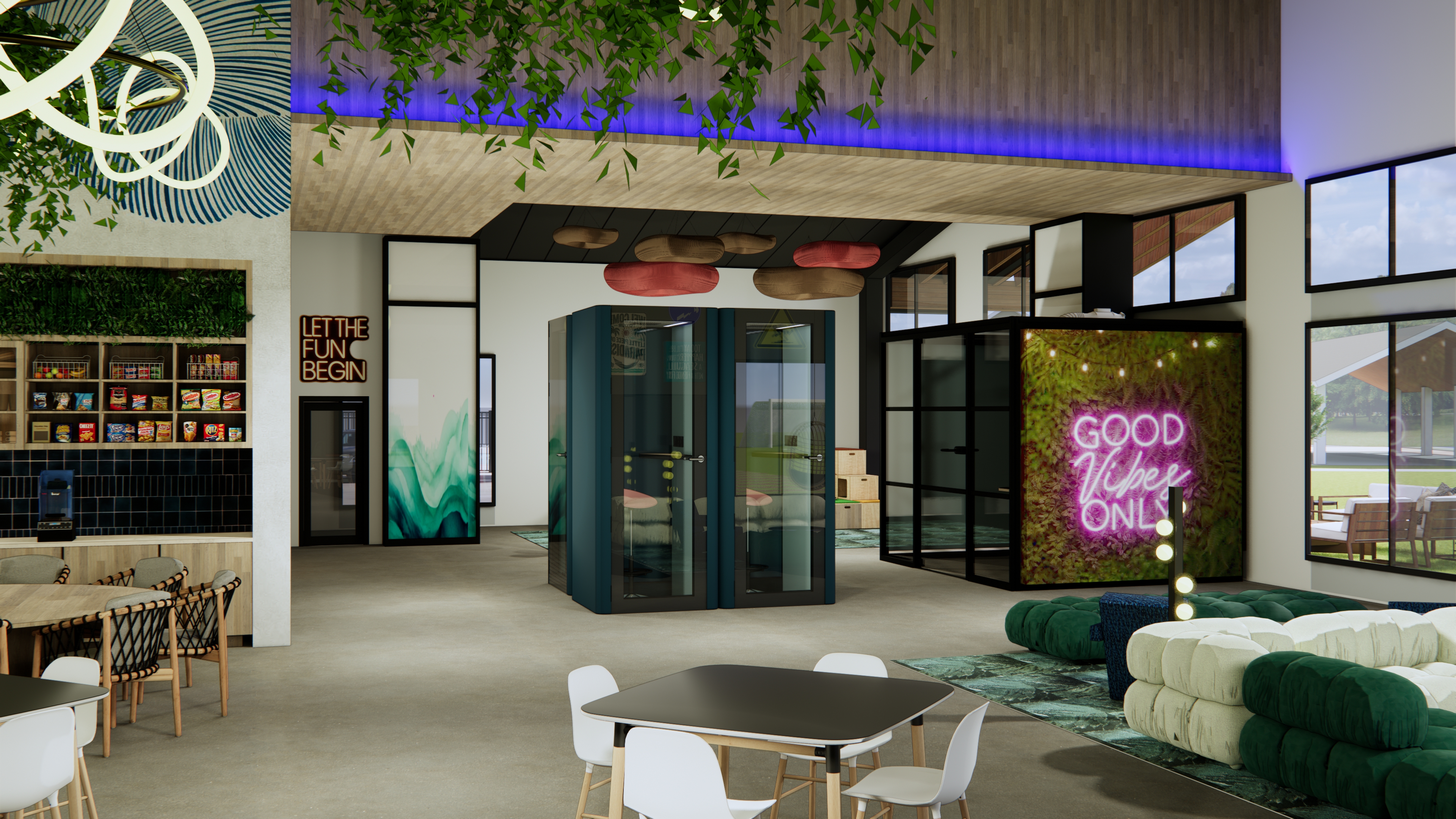 have blue led up lighting at ceiling continue fully across wood soffit so it doesnt look like its missing in the middle