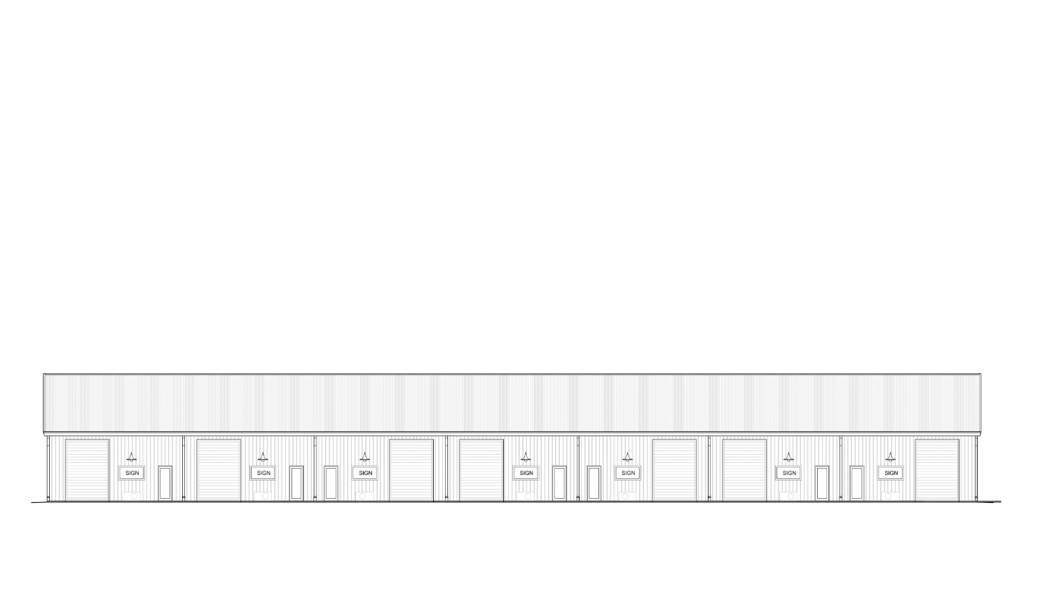 exterior shot create a photorealistic 3d rendering of a modern flex warehouse building based on the attached architectural elevation camera angle drone style 3 4 perspective slightly above roofline looking down toward the front fa ade so both the roof and front elevation are visible exterior modern dark charcoal grey metal siding clean vertical panels dark trim and a matching dark metal roof maintain the repeated bays with large roll up doors pedestrian doors and sign panels exactly as shown in the elevation reference lighting bright natural daylight with soft realistic shadows environment place the building in a clean modern business park with fresh asphalt minimal curated landscaping and a contemporary industrial feel style ultra sharp photorealism accurate materials true to scale proportions subtle reflections on the metal siding and no distortion or stylization