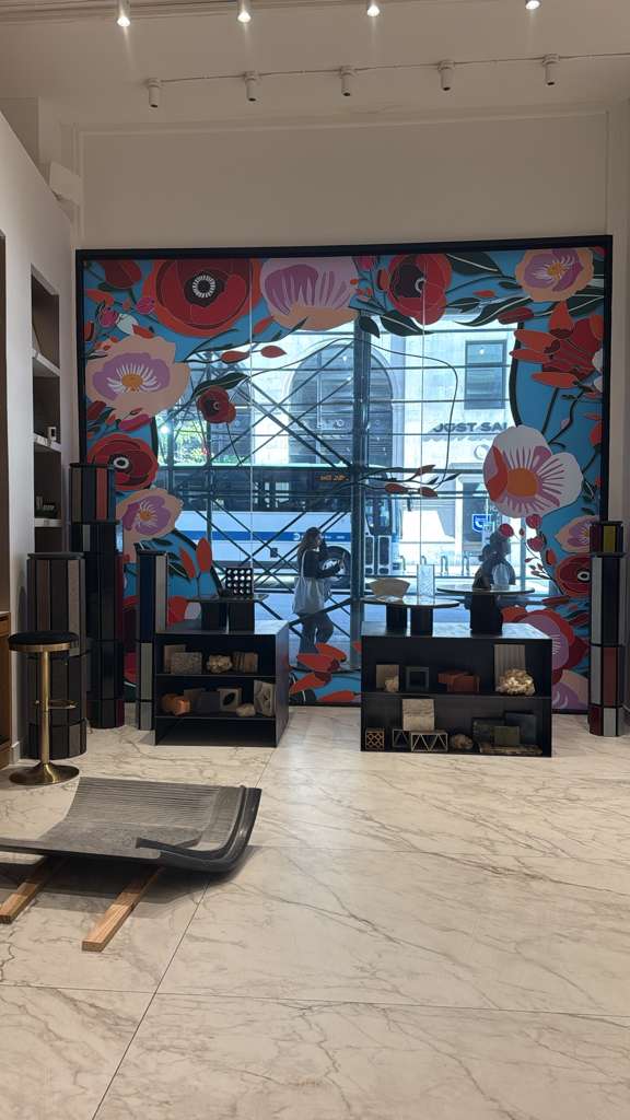 exterior shot generate a photorealistic exterior rendering of a gallery style shopfront located at 284 fifth avenue ground floor new york ny 10001 scene description the fa ade should blend the architectural character of fifth avenue elegant and urban with contemporary minimalism the shopfront features two vitrines display windows left window 767 3 8 w 747 7 26 h right window 87 9 16 w 747 7 26 h both vitrines are framed in travertine or light limestone matching the material tone of the sculptures inside each vitrine display hand crafted stone statuettes inspired by japanese kokeshi dolls arranged on travertine pedestals or monolithic stone blocks as shown in the reference quarry image in one vitrine include a colorful hanging textile element red yellow orange tones for visual warmth and contrast the vitrines should be softly illuminated from within by warm focused lighting 3000 k highlighting the textures of the stone and creating a calm gallery like ambiance visible from the street the exterior context should reflect fifth avenue wide sidewalk subtle reflections on glass muted city background with a few passing pedestrians and parked cars time of day late afternoon with natural daylight and interior lights visible through the glass style mood photorealistic elegant and refined neutral and warm palette travertine beige stone soft golden light clear glass camera view at street level slightly angled to show both vitrines and a portion of the fifth avenue streetscape