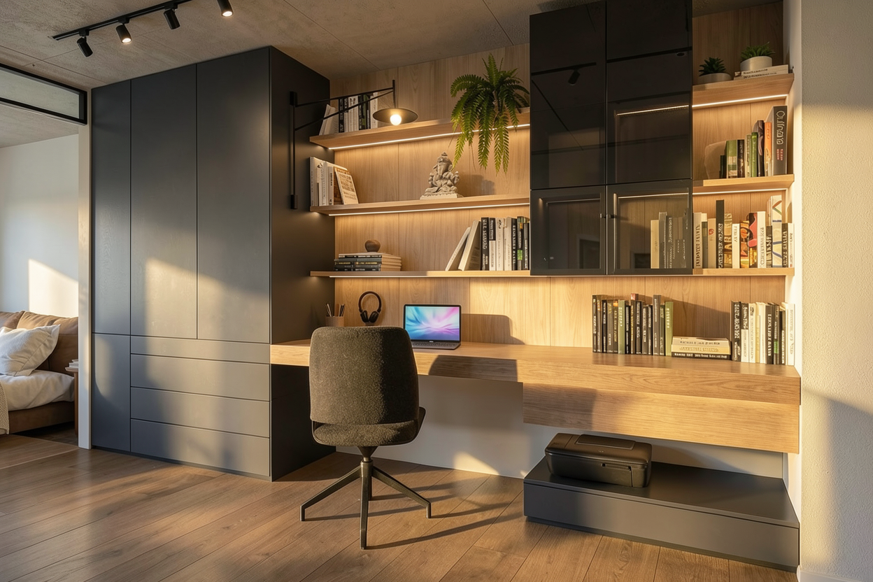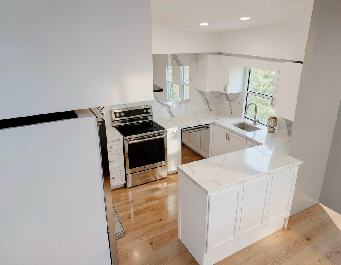 this is a hunting cabin so please have a hunting cabin feel with polished concrete floor natural wood shaker style cabinets white quartz countertops natural wood plank ceiling whitetail buck mounts on the walls along with rustic hunting cabin decor