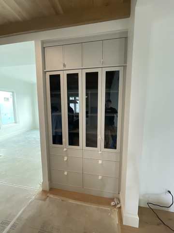 do not change the cabinets in any way preserve the exact cabinet colors materials finishes dimensions door and drawer styles hardware spacing alignment and all geometry exactly as shown do not alter the countertop shape backsplash appliances flooring lighting fixtures or wall structure only remove the construction materials clutter and mess from the scene clean the room and make it look finished and staged add a few simple tasteful home accessories appropriate for the style of the space but do not add or remove any furniture windows or architectural elements maintain the original lighting direction and realism enhance clarity and polish the photo while keeping the cabinetry and room design completely unchanged do not alter the lighting to keep the cabinet colors as they are in the image add new flooring stage the glass shelves with simple decor put gold hardware on the door and drawer fronts remove the reflection in the glass