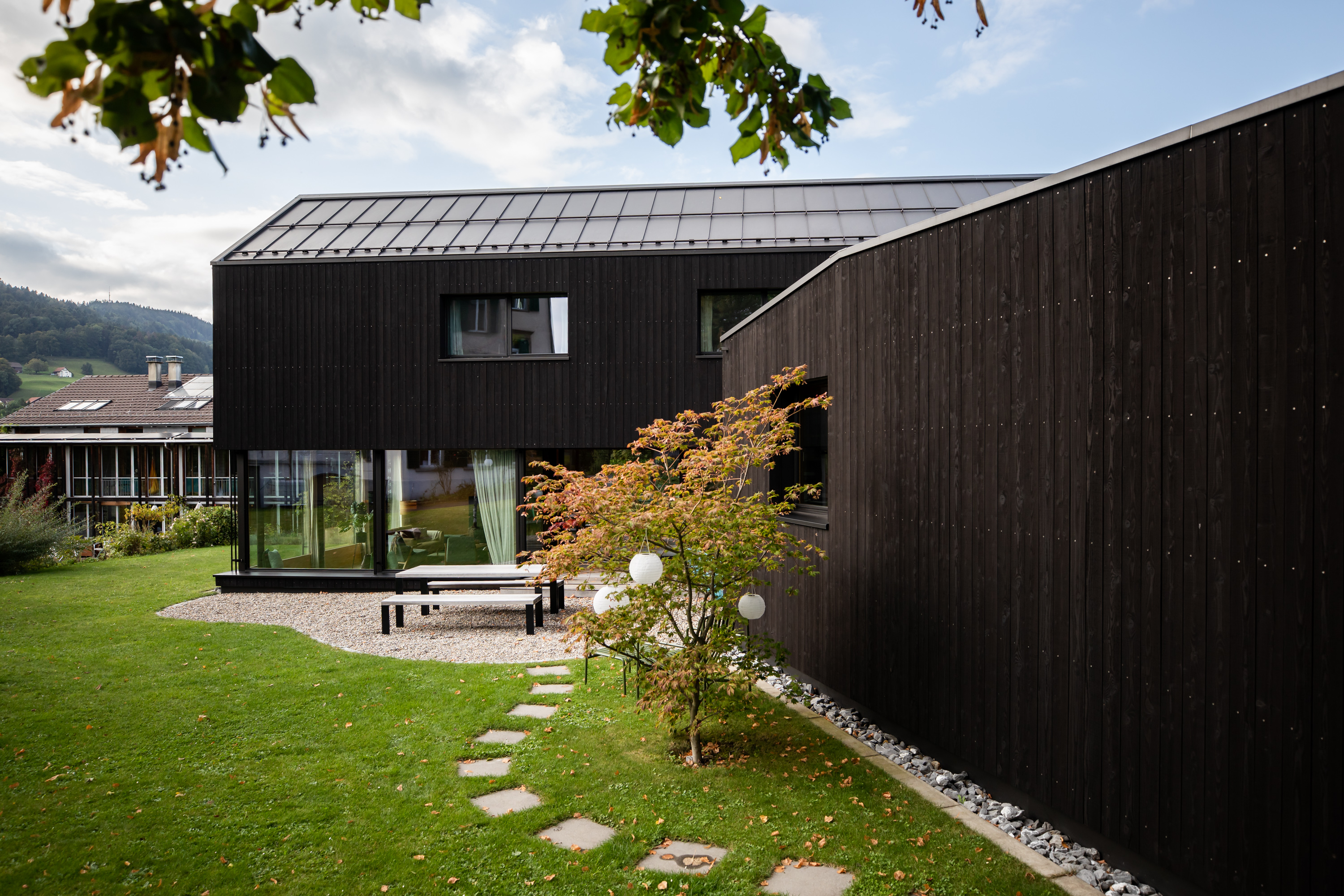 ersetzt die schwarze holzfassade mit 2mm putzabrieb farbton beige