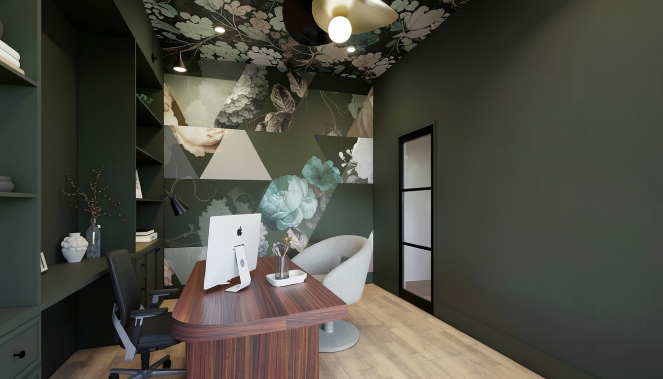 maintain colors continue same pattern wall paper on the ceiling and from the wall do a oval desk and new chair and minimalistic decor