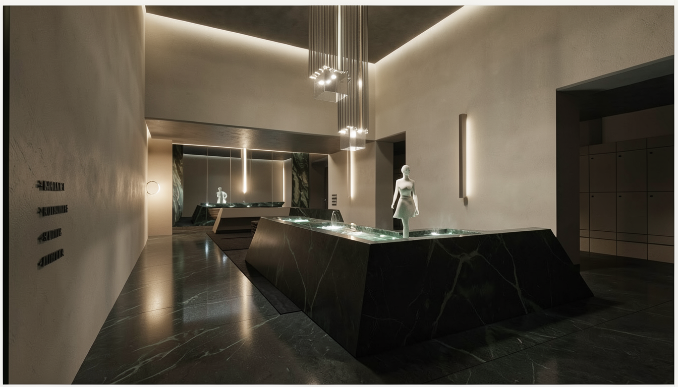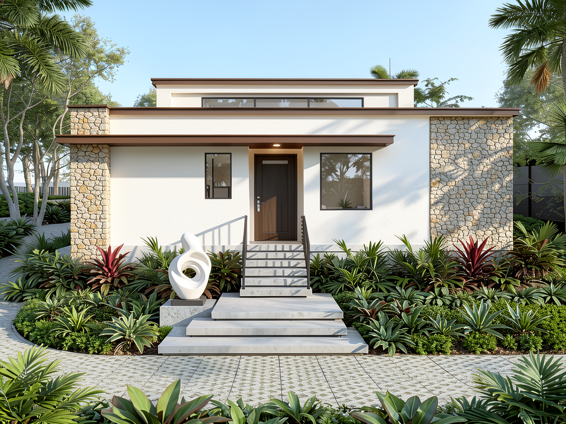 modify only the material in the rectangular wall area on the right side apply modern cut limestone blocks similar to mediterranean ashlar limestone use large rectangular limestone blocks with horizontal coursing and thin joints the stone should be light warm beige with a smooth natural limestone texture the stone panel must remain flat and stay within the rectangular area only do not extend the stone past the roof edge or into the window area keep all other walls smooth white stucco do not add columns thickness or structural changes maintain the same architecture stairs landscaping and camera angle