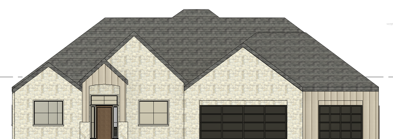 render this home realistically without changing the structure roof door or garage doors keep all materials the same light stone exterior dark gray roof shingles and smooth painted board and batten siding in a warm taupe color similar to craneboard mocha not wood grain on the two vertical sections the front door should stay walnut wood change the window grids and trim to a light cream tone that complements the stone add realistic landscaping with green shrubs tan and brown grasses and small neutral trees use a natural daylight sky with soft shadows make the image look like a professional architectural photograph not ai generated