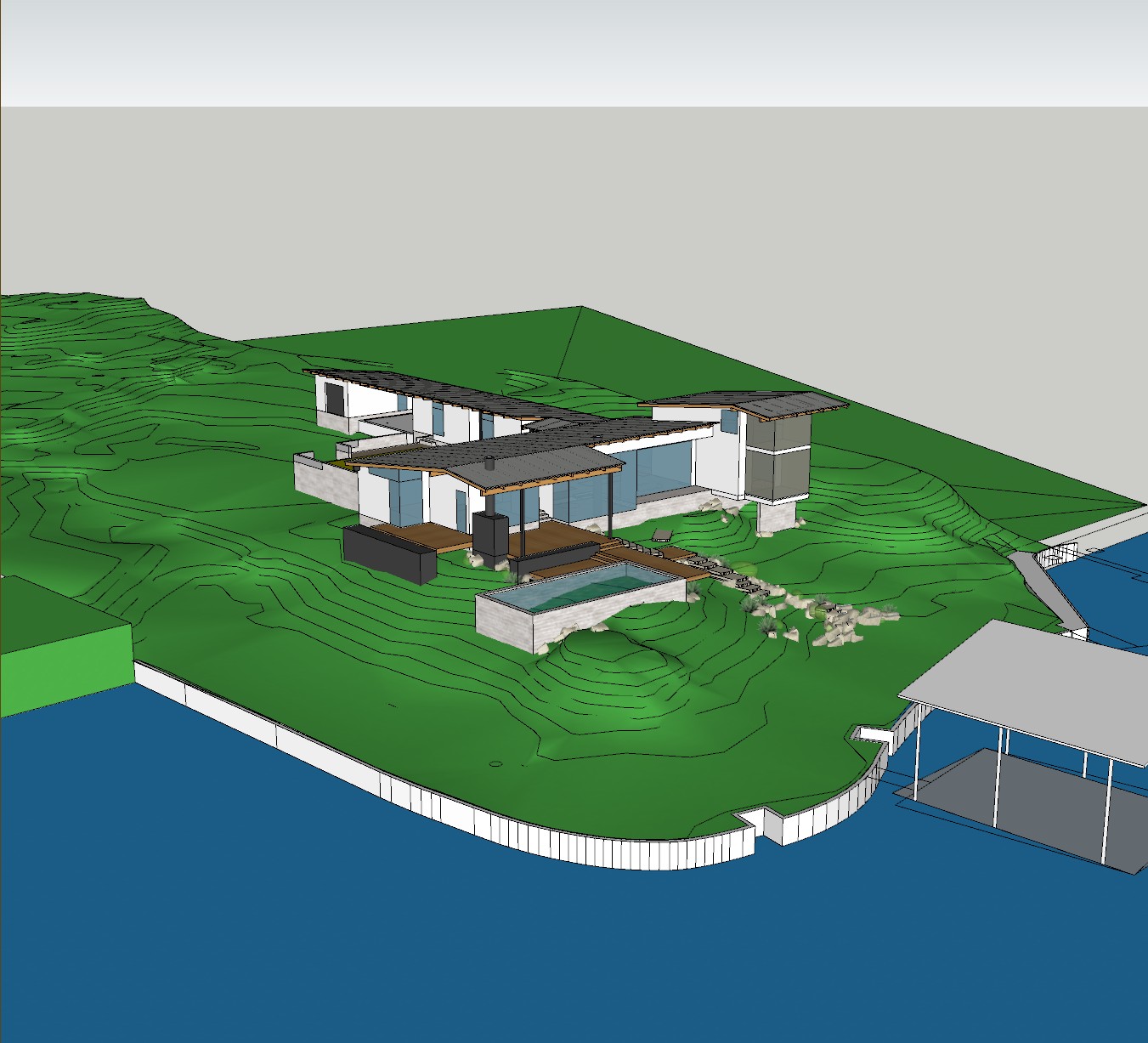 aerial architectural rendering of a contemporary lakehouse residence on inks in the texas hill country late summer afternoon light south facing view over the lake looking back at the house sun should be late after noon in view of the camera follow the exact lake shore geometry do not change anything calm blue green water at normal level with gentle wind ripples shoreline has a concrete bulkhead with native grasses above the lake is positioned in the foreground blue zone and takes up the bottom portion of the rendering add a boat house connecting to the shore with a boat in the water rolling texas terrain with scattered live oaks and ashe juniper dry golden grasses with some green pockets prickly pear accents warm atmospheric haze over distant low hills the lakehouse sits lightly on the site with a refined modern material palette white stucco siding light gray standing seam metal roofing exposed timber rafter tails retain the exact structure window arrangement rooflines foundation height two story portion is a screen porch and proportions exactly as shown in the reference image minimal site disturbance native drought tolerant landscaping natural pathways photoreal architectural visualization ultra realistic lighting crisp shadows crisp building edges high detail vegetation and ground textures glass reflections and a vibrant clear sky with light atmospheric depth render in hyper realistic architectural visualization quality 8k resolution match the perspective of the image exactly use the topo lines in the image to create an accurate site