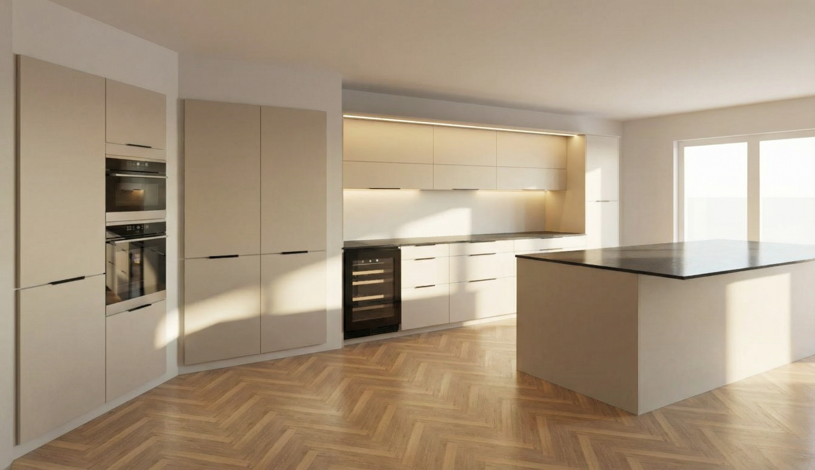 ajoute de l clairage sous les meubles hauts et une lumi re de jour ajoute des tabourets devant l ilot et une table manger en bois rectangulaire sur l espace vide gauche