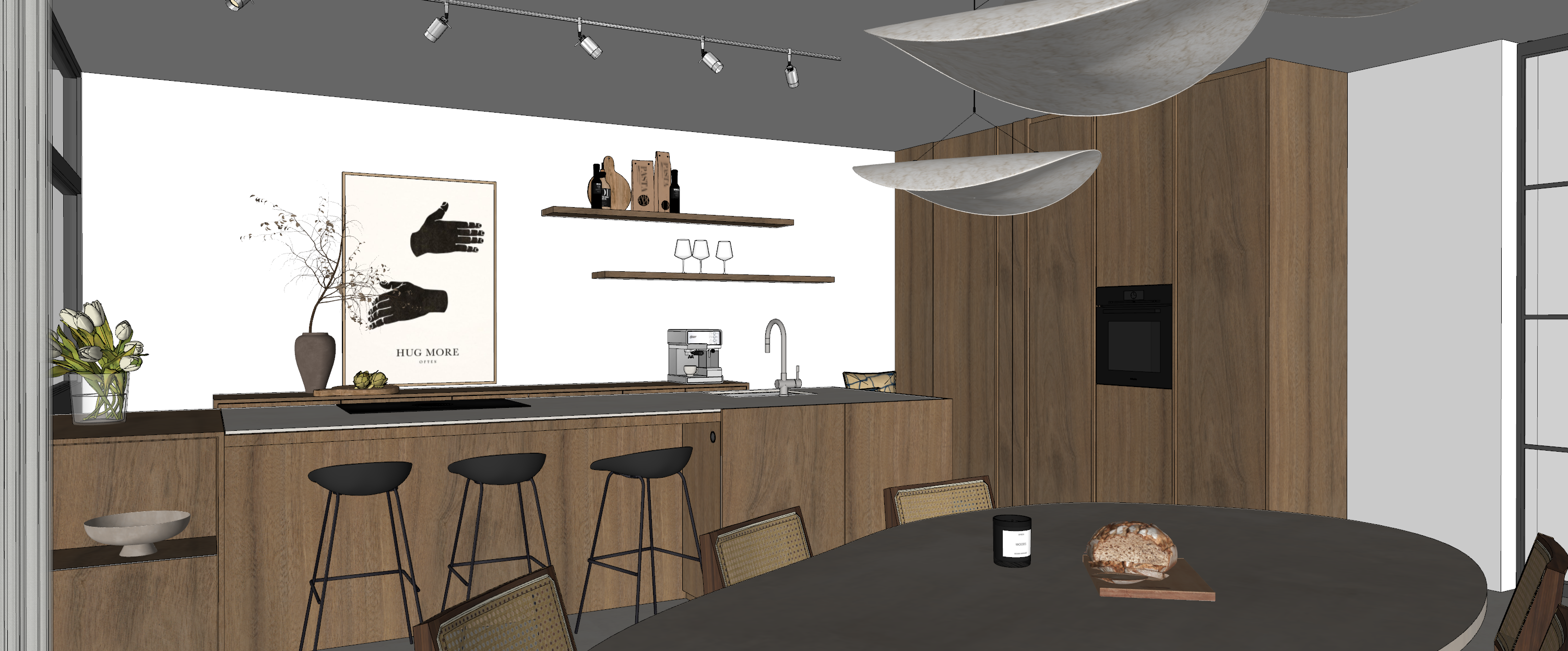 make this sketchup design photorealistic with sun coming from te window on the left on the right is a steel door leading to a space with hazy curtains