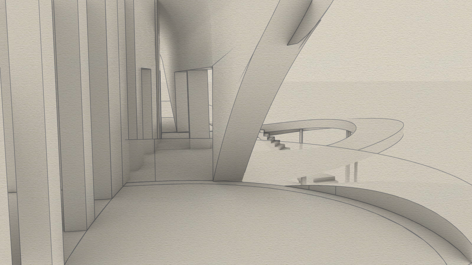 architectural watercolor rendering of a balcony view looking out with the building to the left and mountains and clouded sky to the right realistic materials background and edges dissolve into loose watercolor washes and white paper edges not full bleed with soft unfinished fade around the image visible pencil and ink linework with light technical annotations artistic yet grounded balance of precision and painterly abstraction calm morning light concept architectural visualization style