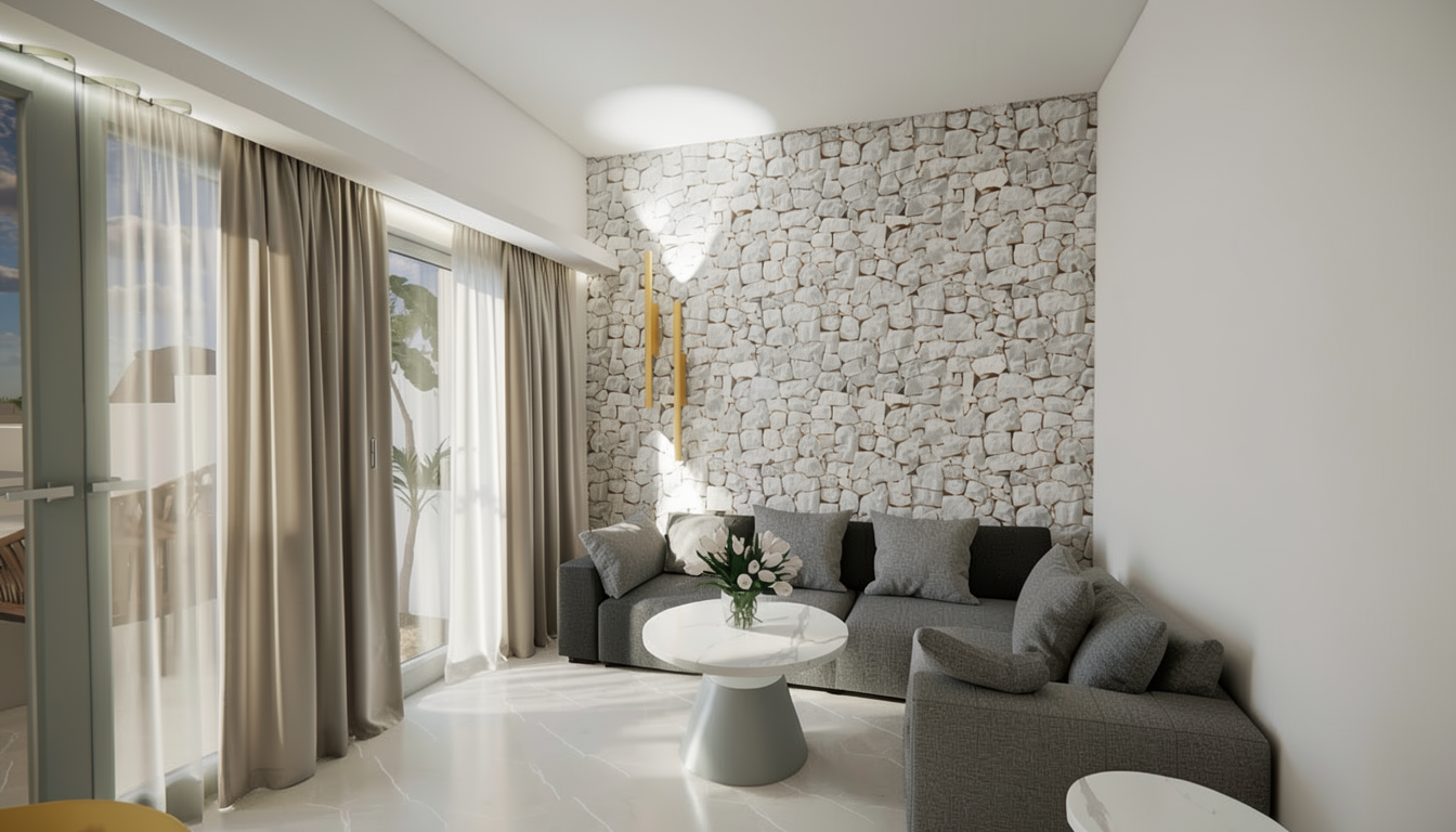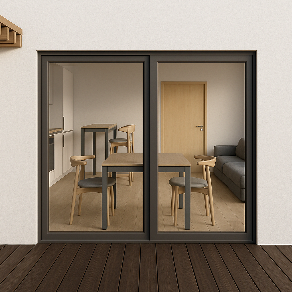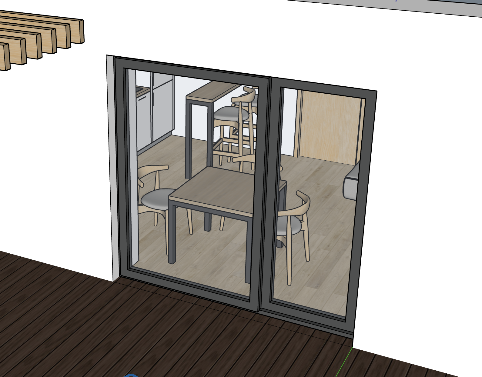 exterior shot vykresli pohled skrze okno do interi ru respektuj hel pohledu st l a barov deska v dez nu dub s antracitovou podno idle d ev n podlaha dez n dubov lamely kuchy sk linka b l lesk dve e dez n dub uvnit tlumen sv tlo ze sv tidel pod stropem