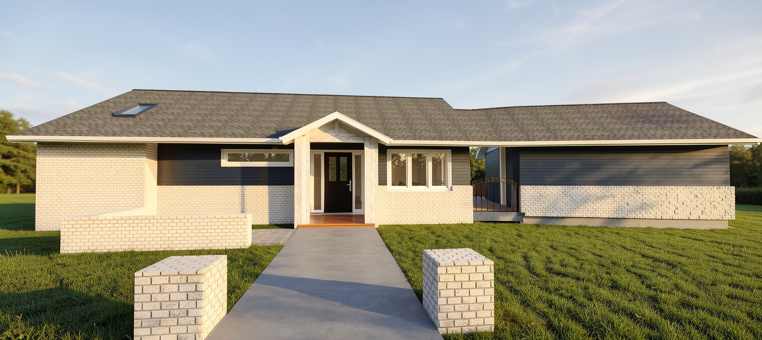 create color rendering gray stone gray siding dark gray shingle roof white trim