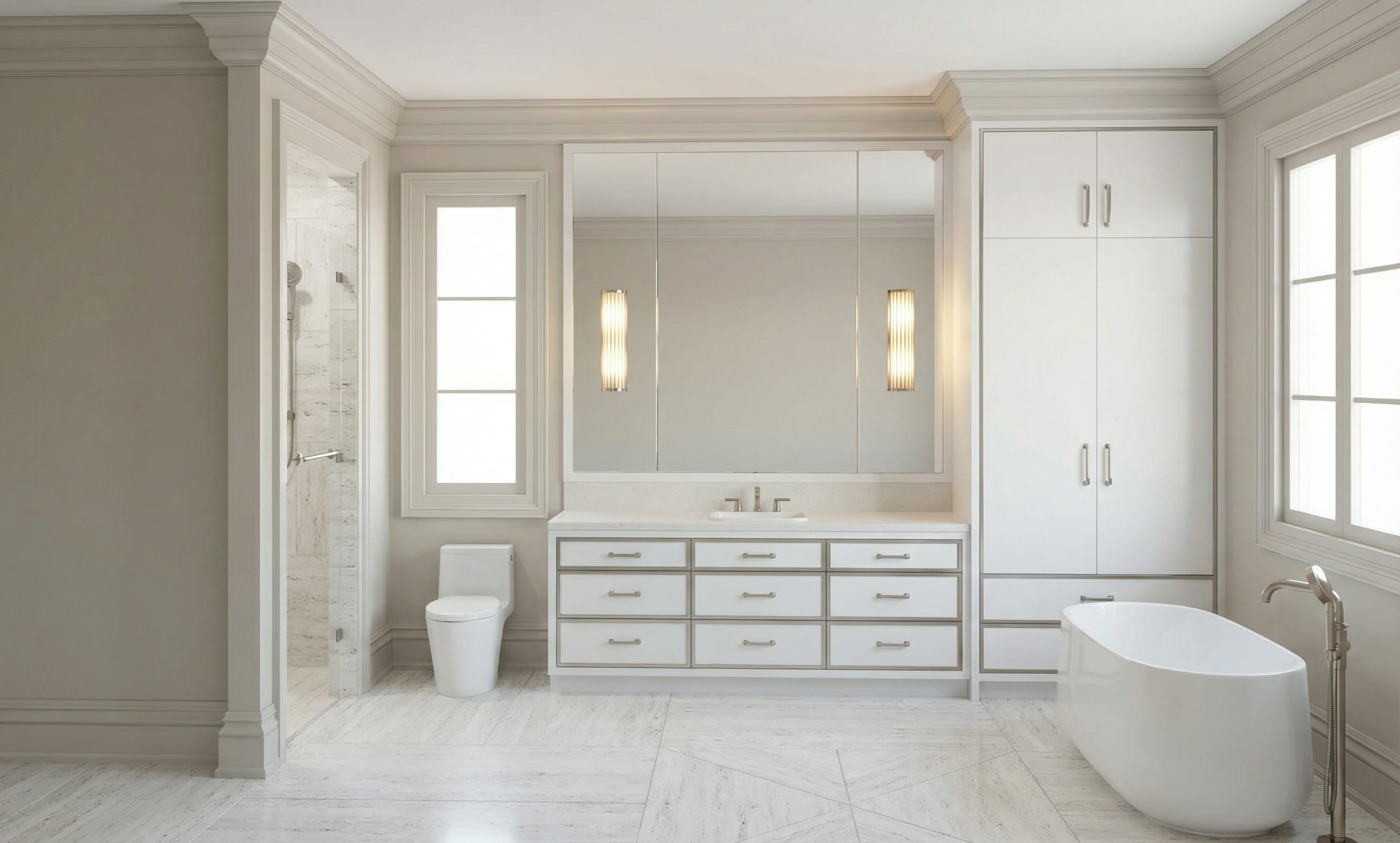 project type photorealistic interior bathroom rendering reference use the provided bathroom image as a strict reference replicate the exact layout proportions architectural details and design intent shown in the image design consistency maintain the same plumbing fixtures lighting fixtures moldings millwork colors and all architectural and decorative details no changes to geometry dimensions or fixture placement materials finishes floor white travertine porcelain tile the floor pattern must exactly match the reference image the veining direction of each triangle must follow the direction shown in the reference image shower walls white travertine porcelain tile matching the floor material all other walls smooth painted drywall in the same color as the reference image casing trim and crown molding painted in the same tone and finish as the walls millwork cabinetry and drawers as per reference 19 mm brushed nickel trim surrounding the drawers hardware plumbing fixtures brushed nickel finish lighting match the reference image lighting exactly in placement color temperature and show them turned on rendering style quality ultra photorealistic materials high detail textures and realistic stone veining accurate scale and proportions realistic shadows reflections and ambient occlusion professional interior photography style high resolution render