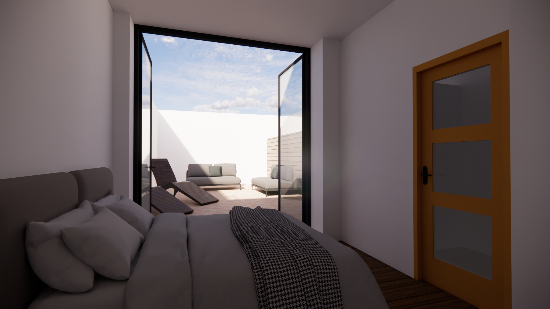 modern bedroom with doors opening up to yard with seating area and greenery the flat is in athens greece modern artwork above bed hidden led lights on the ceiling floor tiles 1 20x1 20 stone beige