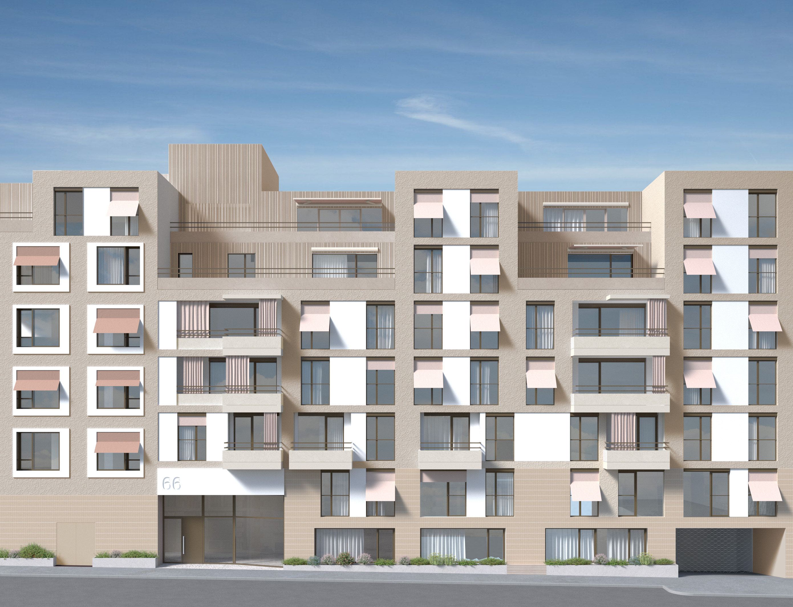 make hyperrealistic beige glazed tiles on the ground floor facade rough plaster above them very bright beige sun shading awnings from fine baby pink textile summer scene