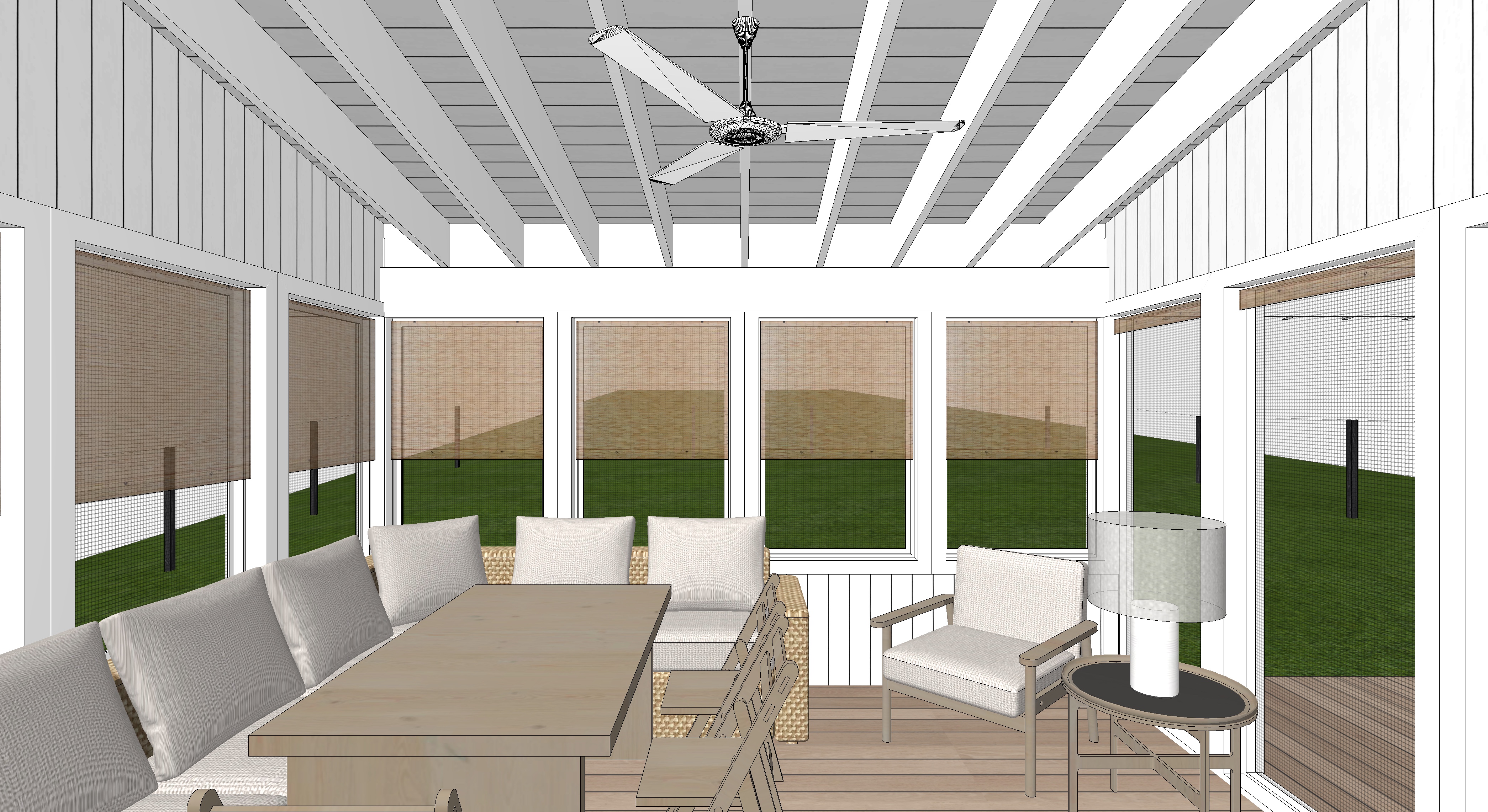 render a beautifully styled modern enclosed patio use white planks for the walls and ceiling with white trims the wooden table should be a light oak with a subtle grain cushions on chairs are a warm taupe color blinds are bamboo and the green grass outside should appear vibrant with a woodland background with rock outcrops create a cozy atmosphere with natural lighting for an inviting and serene ambiance