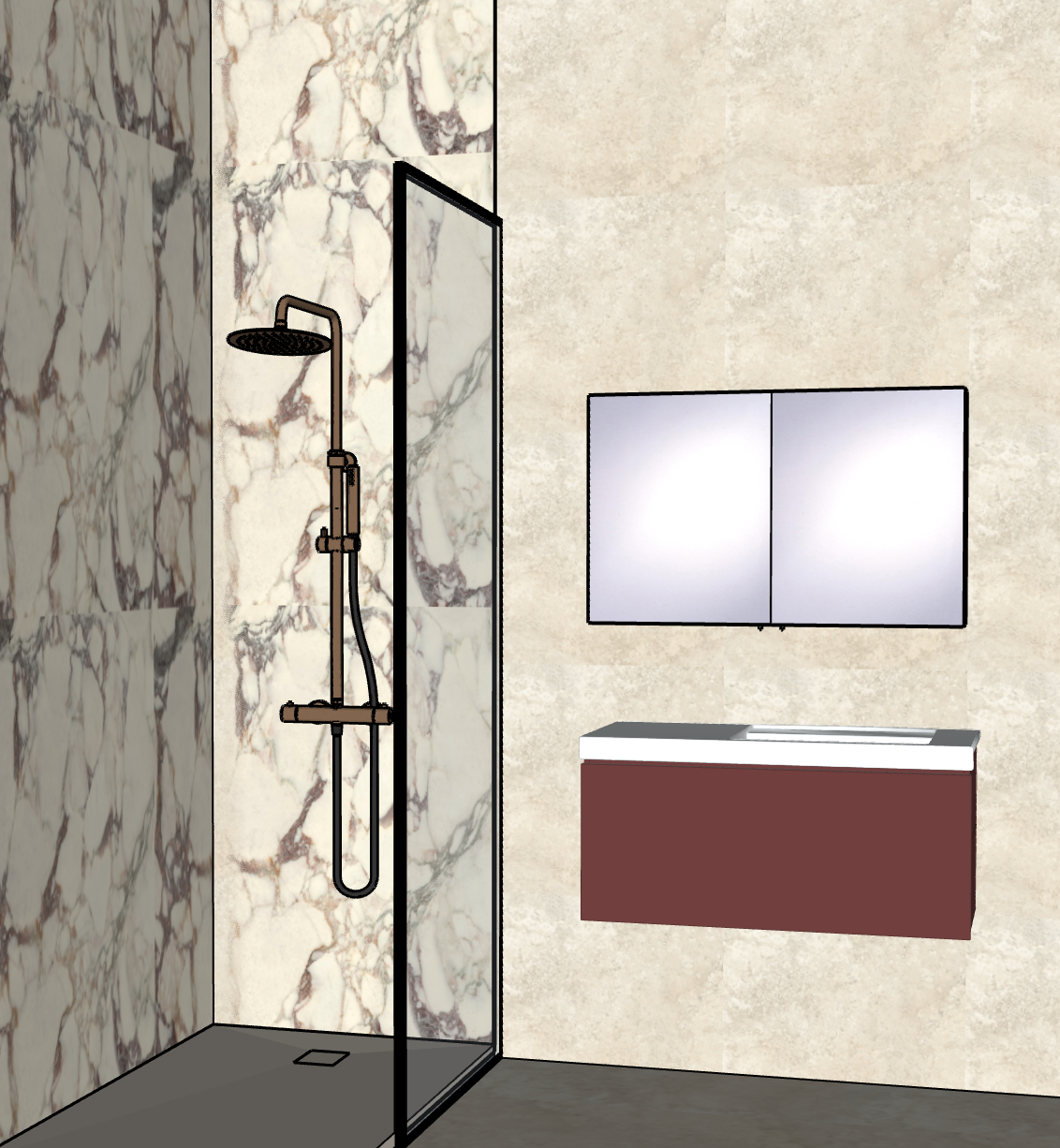 the bathroom furniture is in a bordeaux brown colour floor is in beige