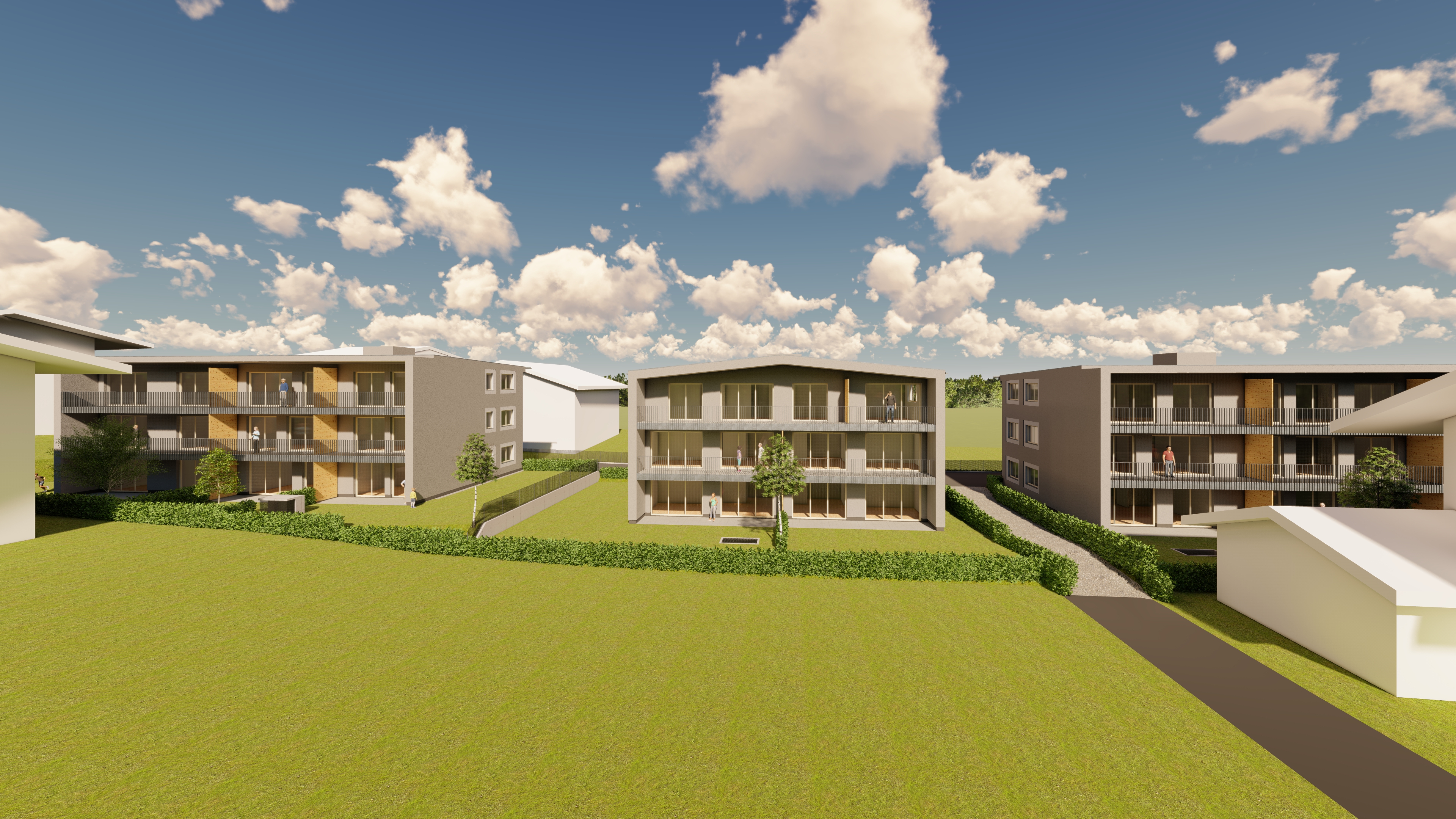 render the scene on a beautiful spring day in the background add snow covered mountains the materials can be retained the facades in gray plaster panels the windows as white plastic windows the railings in galvanized steel and the balcony partition walls made of wood depict the lawn and the sparse planting realistically with central european plants add a few people to the image the entire image should be in realistic and lively lighting