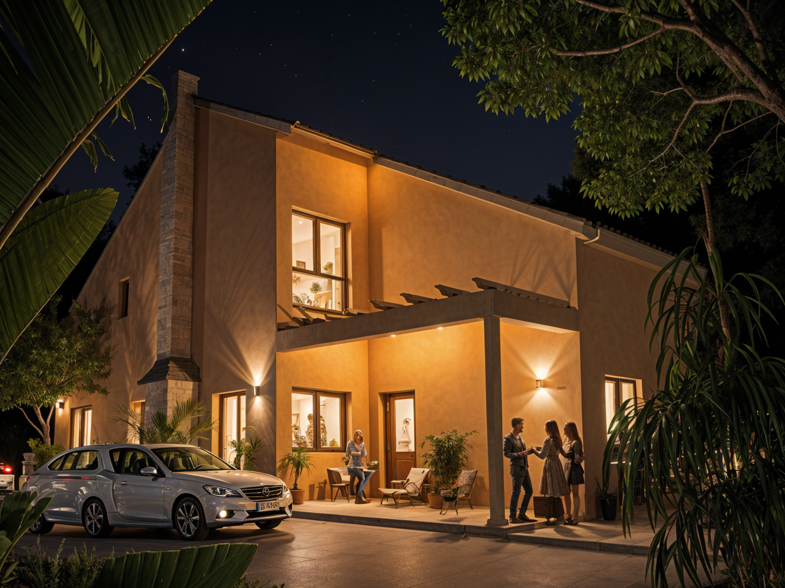 car and trees on the streets it is nighttime and the building is illuminated from both the exterior and interior through the windows