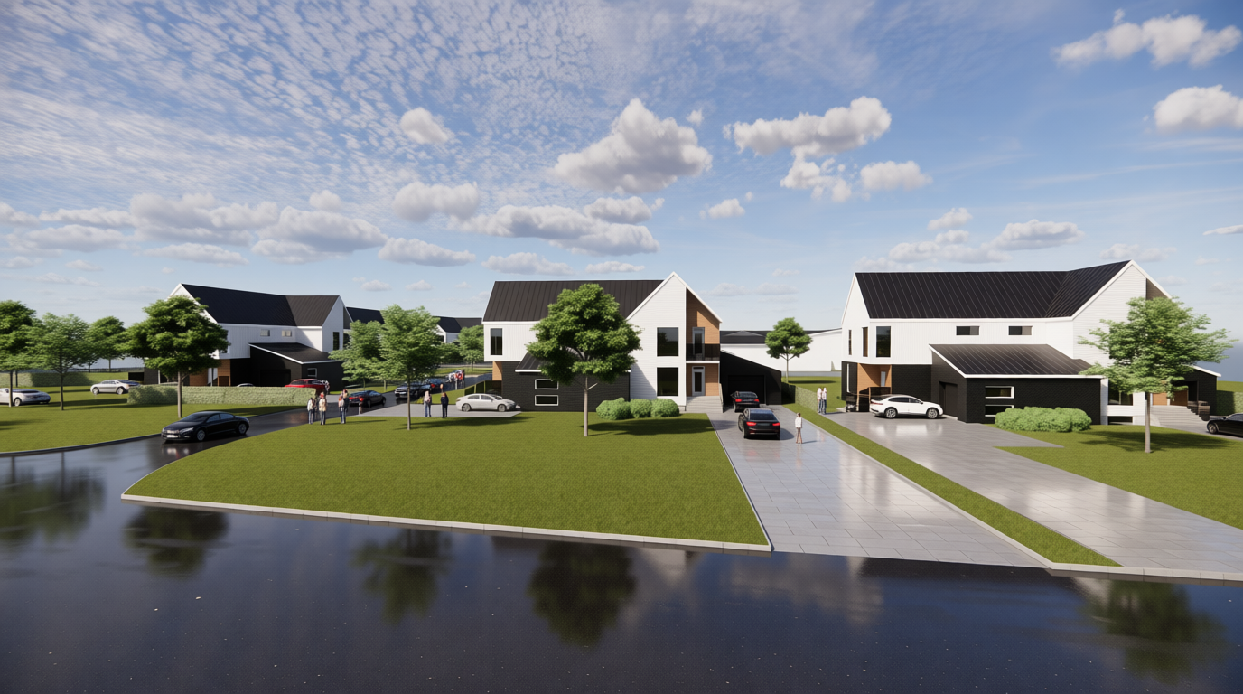 this is a house with blue horizontal siding white windows and doors it has asphalt shingle roof add a concrete driveway from the garage door and a path from the driveway to the porch add lighting fixtures to both sides of the garage and a light to the porch wall add plants and trees and a sunset add fences around the house like its in a neighborhood